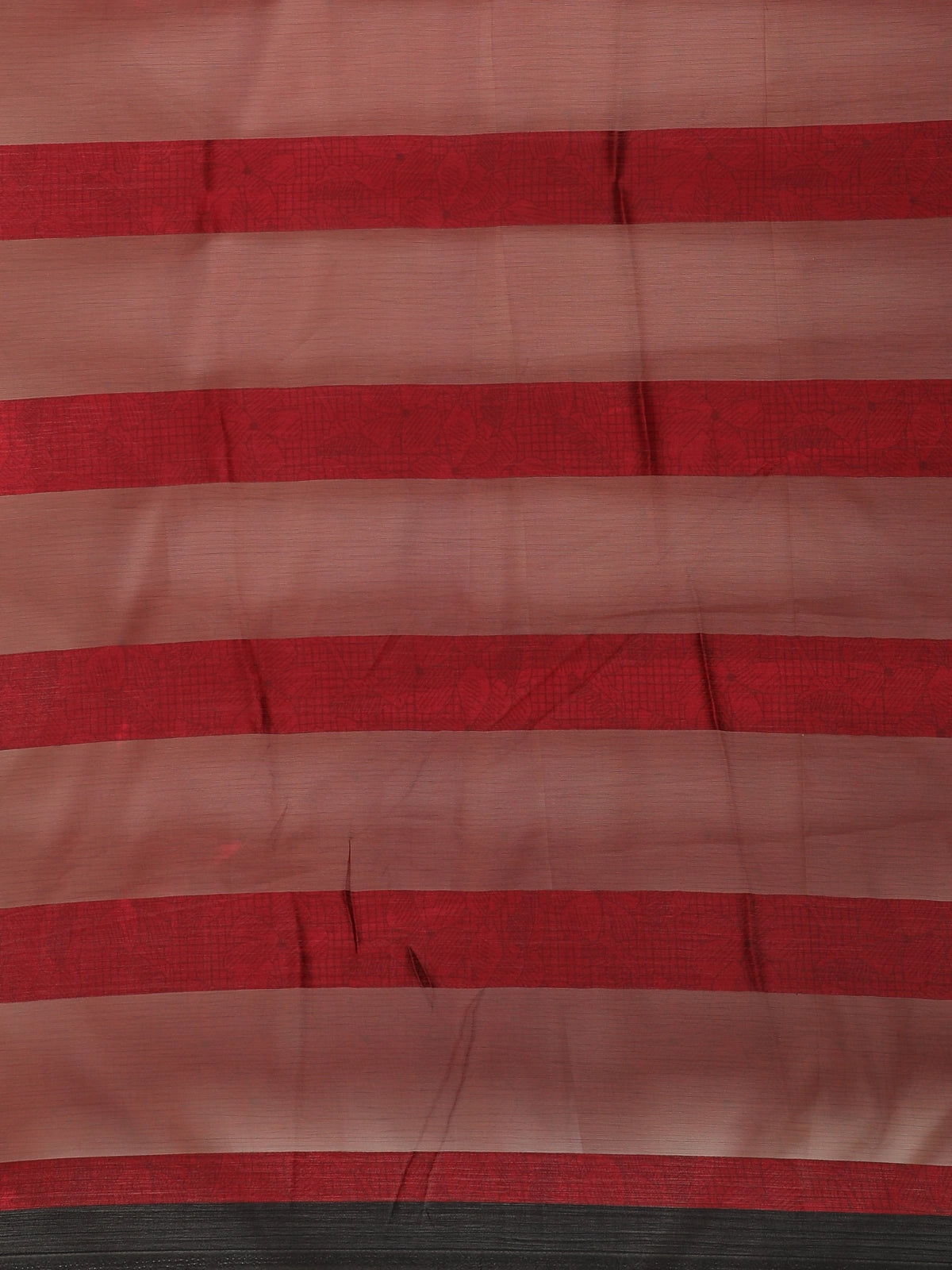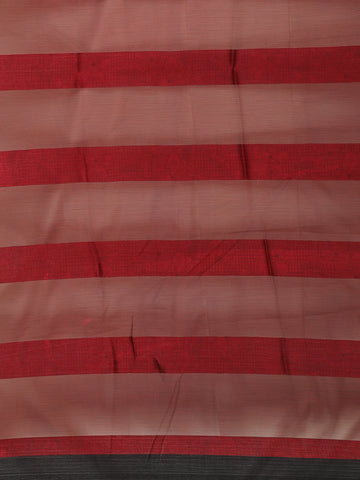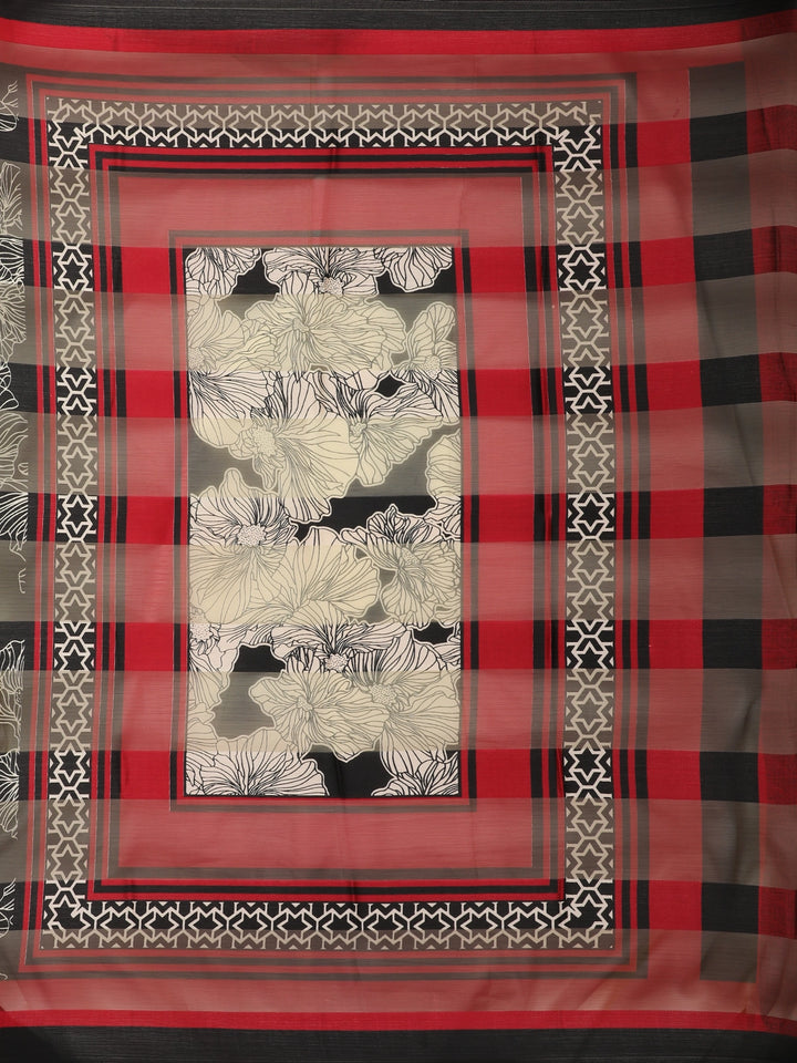 The bold red and black striped border adds a splash of vibrance, beautifully balancing the elegant floral detailing. The pallu shines with a stylish framed floral block design, making it a standout piece when draped.