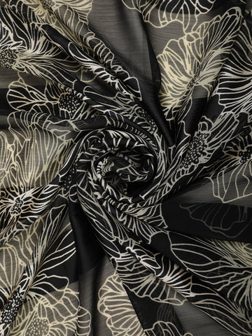 Elevate your wardrobe with this Black Floral Printed Chiffon Saree styled with a striking contrast red border. The saree features soft floral outline prints across the body, giving it a modern yet graceful appeal. The flowy chiffon fabric ensures a lightweight, airy drape that flatters every silhouette comfortably.
