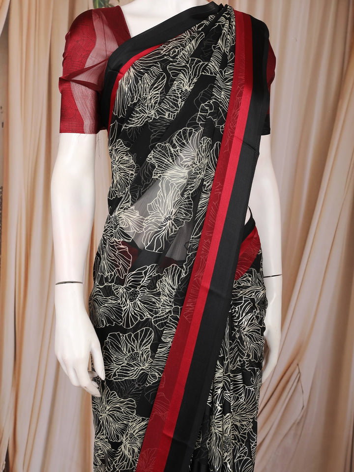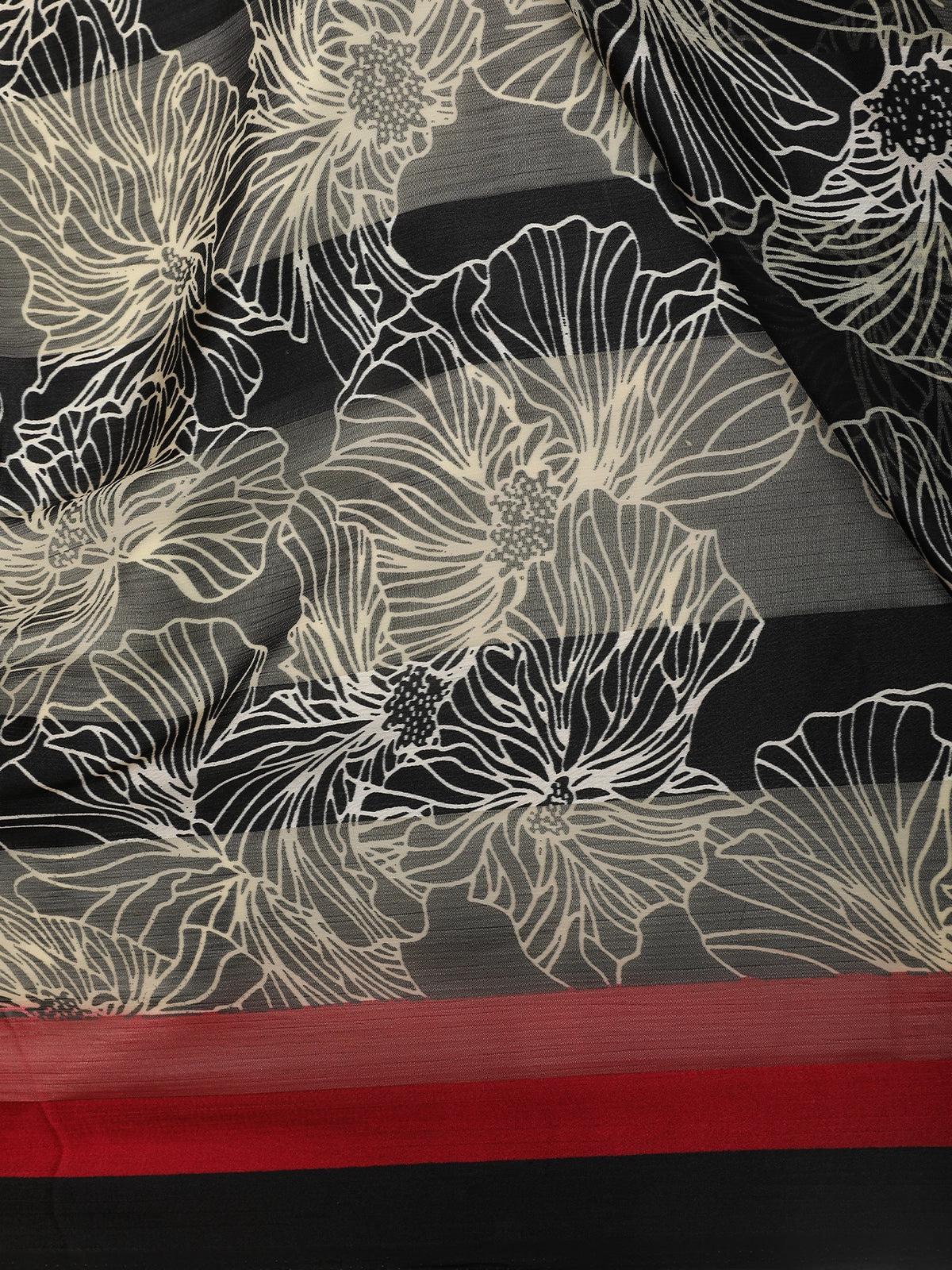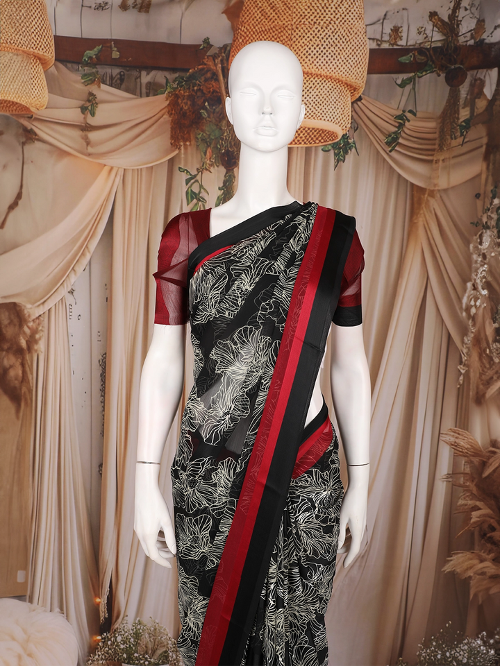 Black Floral Printed Chiffon Saree with Contrast Red Border