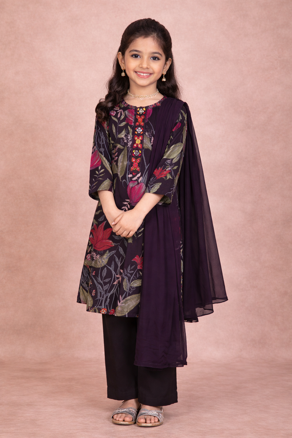 Black Floral Printed Cotton Kids Salwar Suit With Dupatta