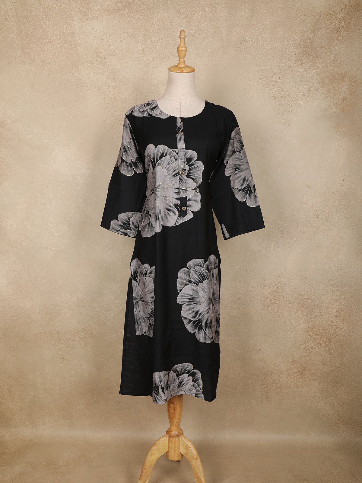Featuring a classic round neckline and 3/4 sleeves, it offers a flattering fit that enhances your silhouette. The straight-cut design falls gracefully for a neat and polished look.
