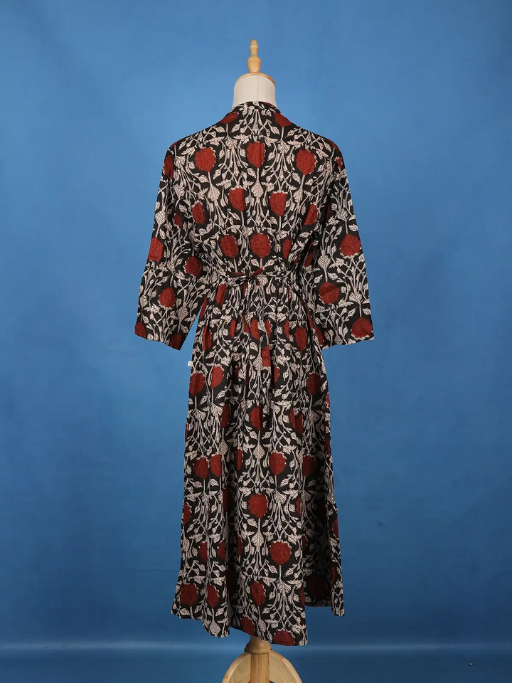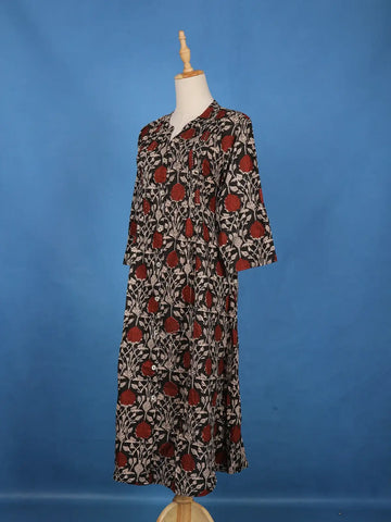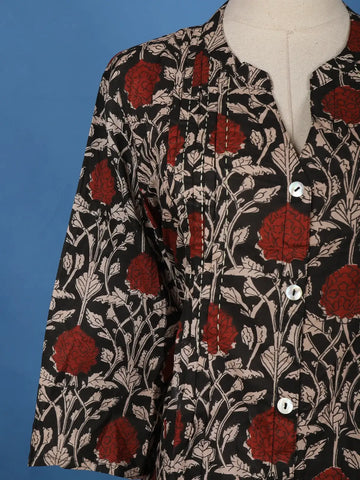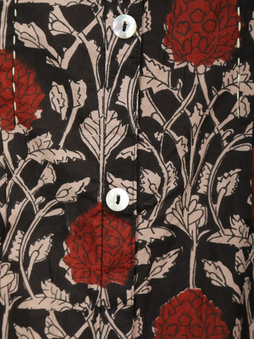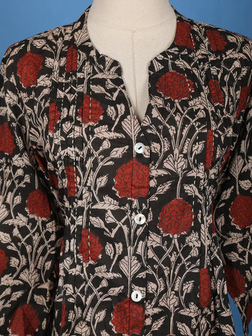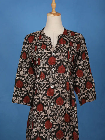 Elevate your everyday look with this black floral printed cotton kurti, designed for comfort and elegance. Featuring a Chinese collar with a subtle V-slit neckline and a button-down front, it combines a touch of contemporary style with traditional charm. The 3/4 sleeves add practicality, while the soft cotton fabric ensures all-day breathability. Its floral motifs in beige and maroon hues create a graceful contrast against the black base, making it perfect for both office wear and casual outings. Finished with a waist tie-up at the back, this kurti offers a flattering silhouette that suits all body types. Pair it with leggings, palazzos, or wear as a dress for a versatile look.