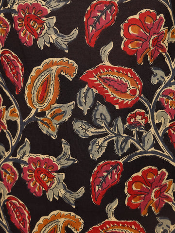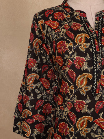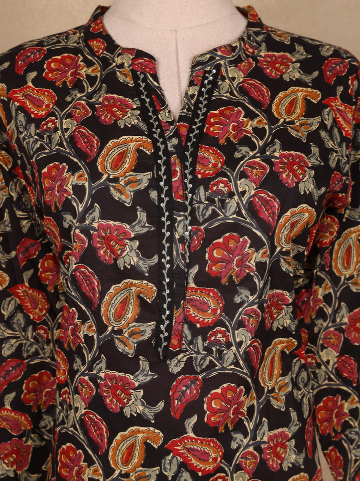 Infused with timeless elegance, this Black Cotton Salwar Suit showcases a vibrant hand-block-inspired floral and paisley print in striking hues of red, mustard, and beige. The intricate motifs flow gracefully across the kurta, giving it a touch of ethnic sophistication. The mandarin collar neckline features delicate thread detailing, adding a subtle handcrafted charm.