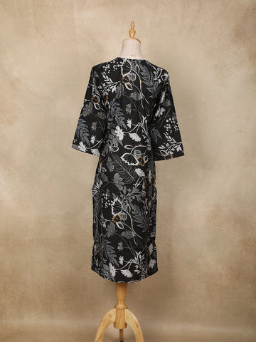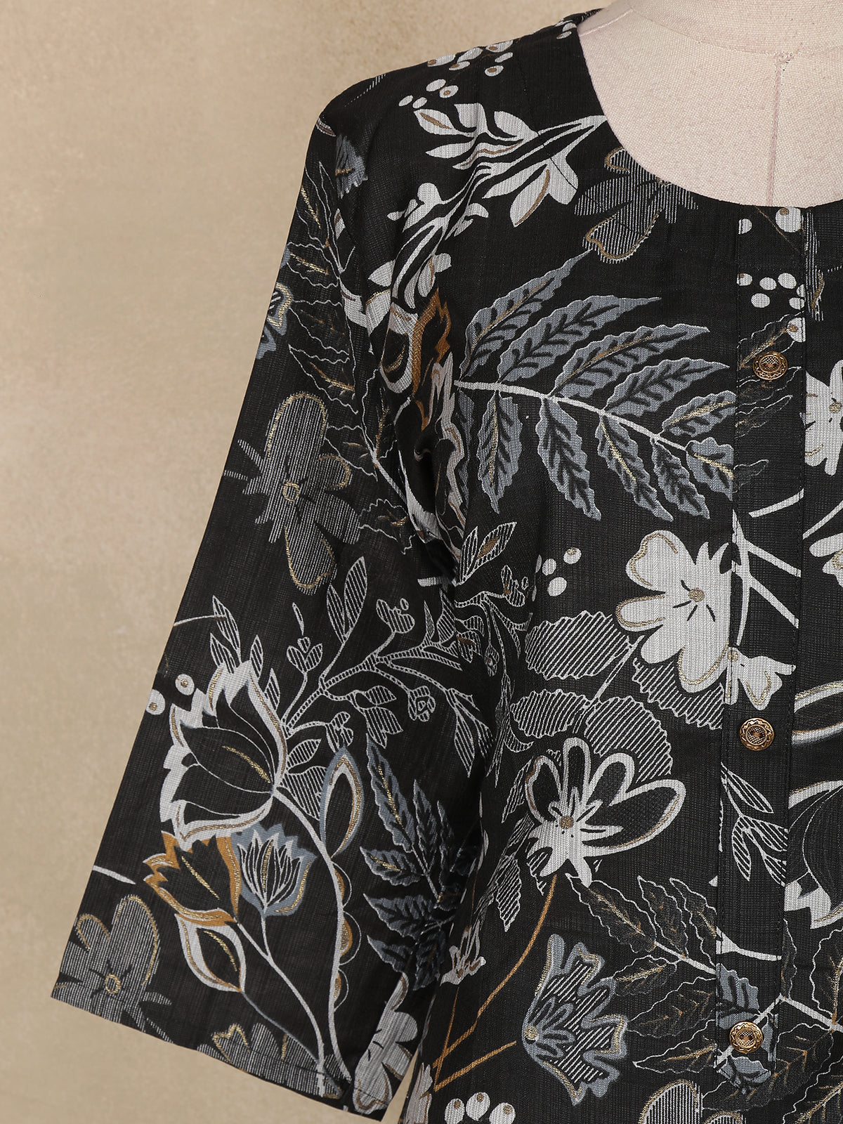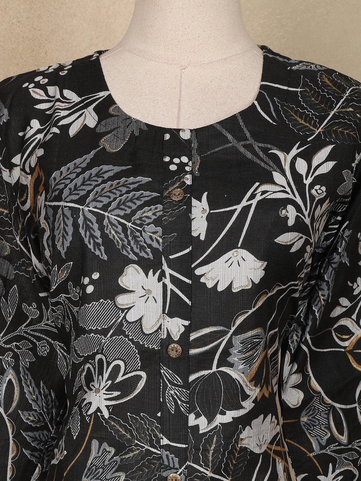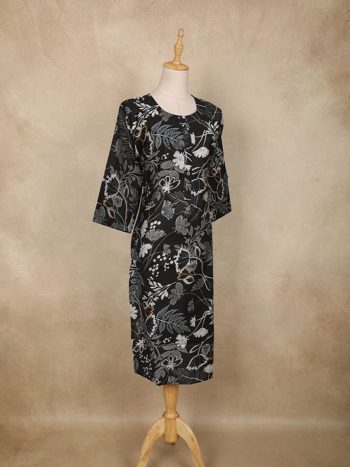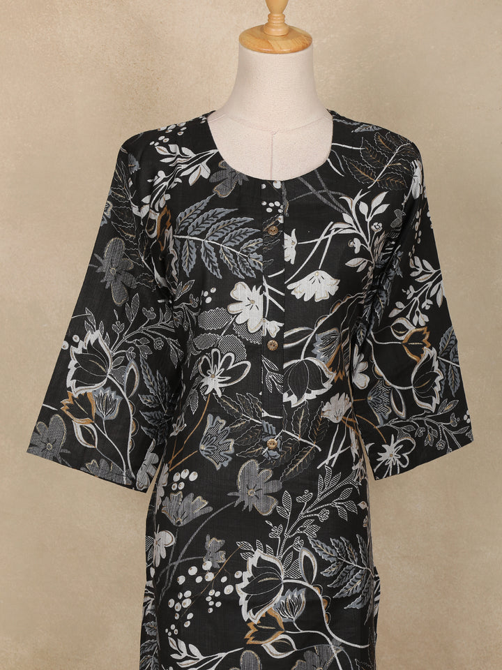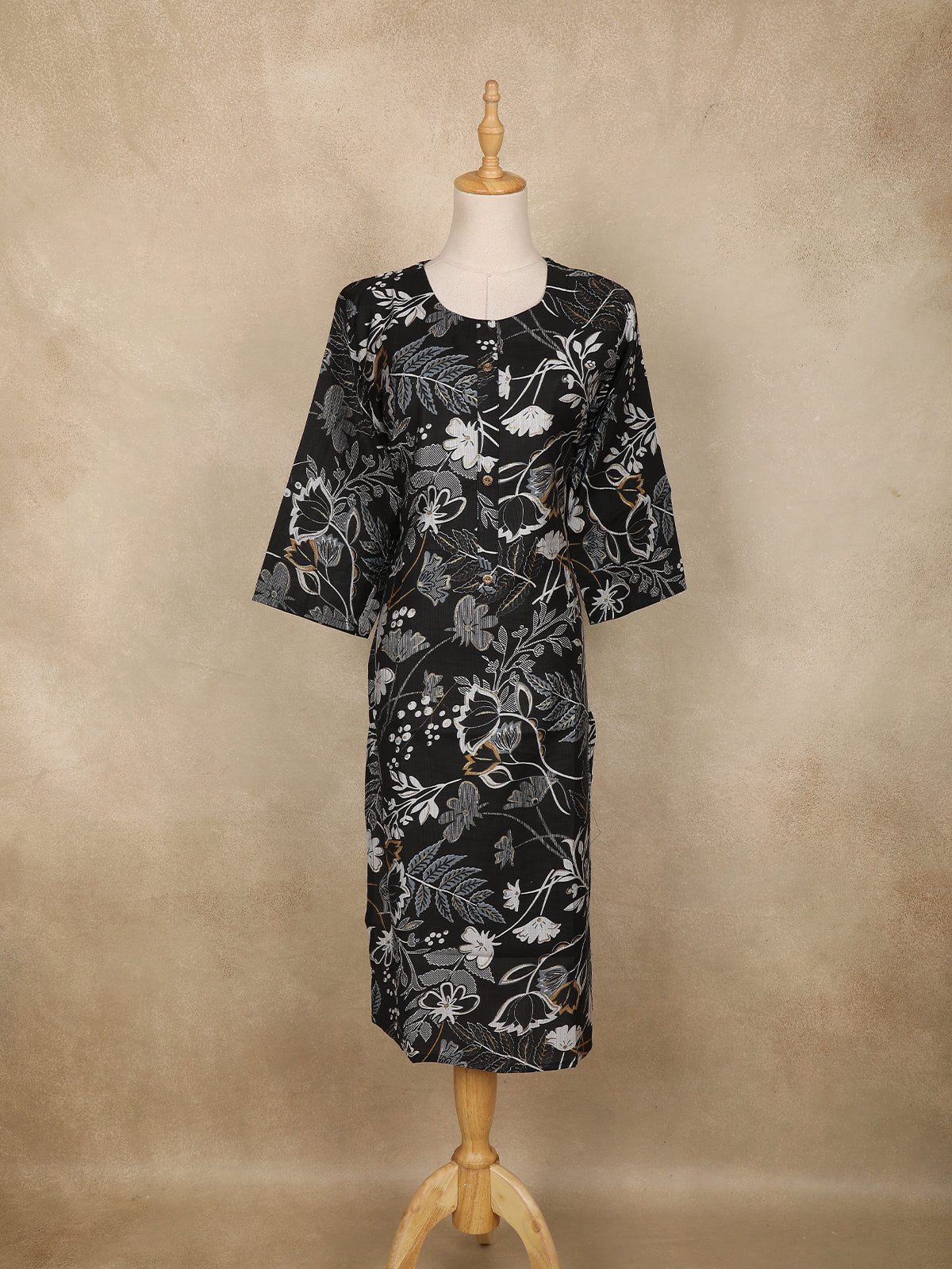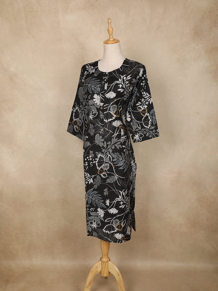 Elevate your everyday look with this classy Black Floral Printed Cotton Straight Kurti. Featuring a stylish mix of grey and subtle golden floral motifs, this kurti offers the perfect blend of elegance and comfort for regular wear. Made from breathable cotton fabric, it keeps you cool and comfortable from morning to evening.
