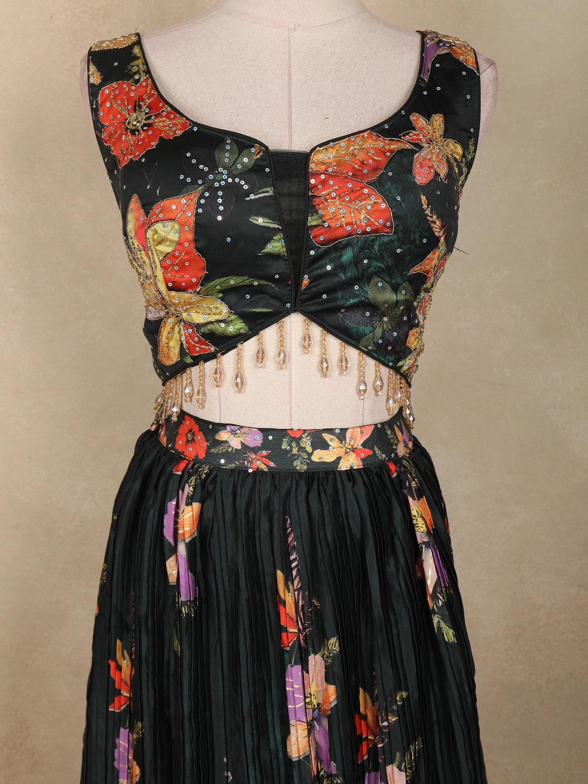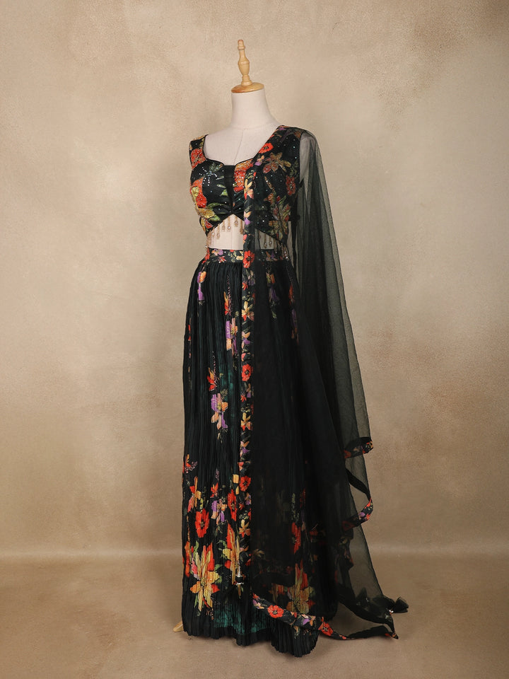 The pleated lehenga adds graceful volume and fluidity, enhancing every twirl with soft, rhythmic movement. The contemporary blouse features bold floral motifs, delicate embellishments, and a stylishly structured silhouette that flatters the figure with ease. Subtle sequin highlights add a hint of sparkle, making the ensemble perfect for evening functions and festive occasions.