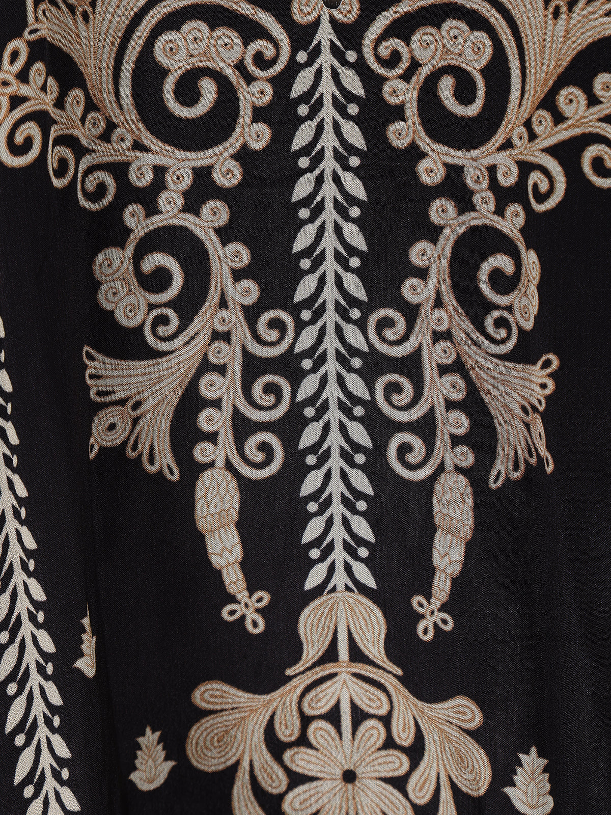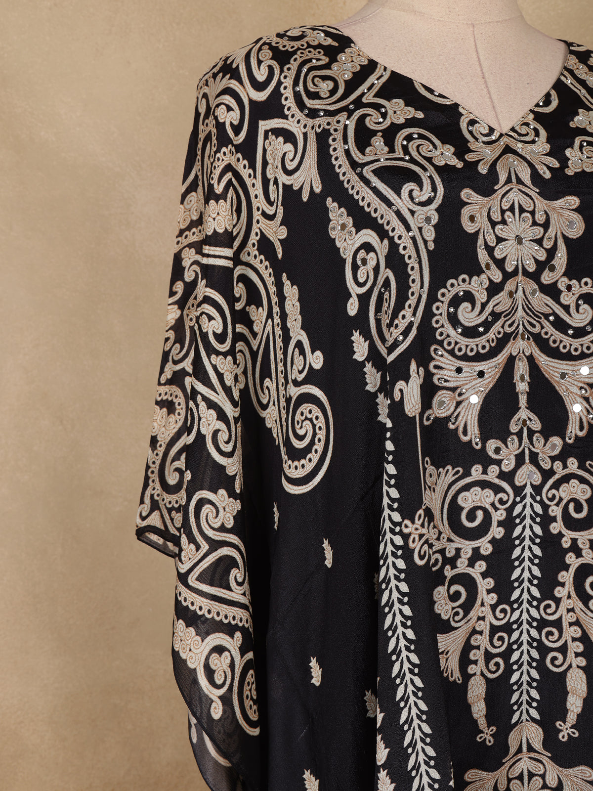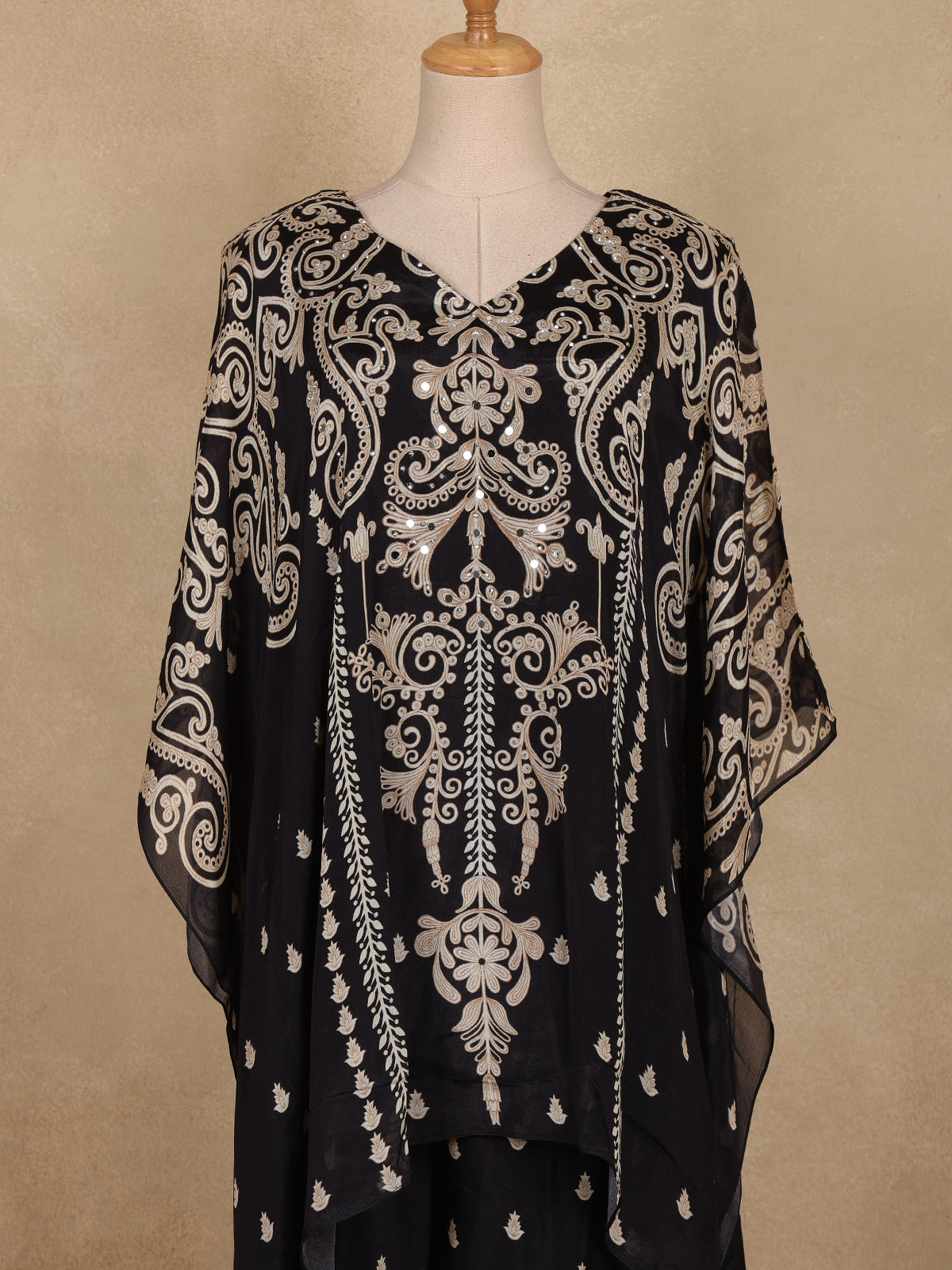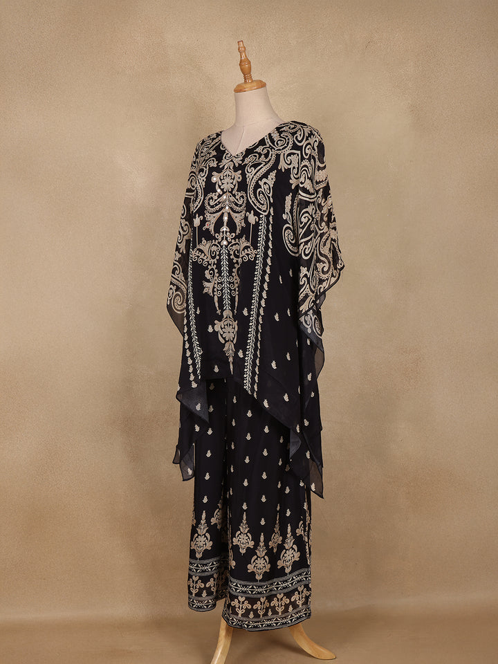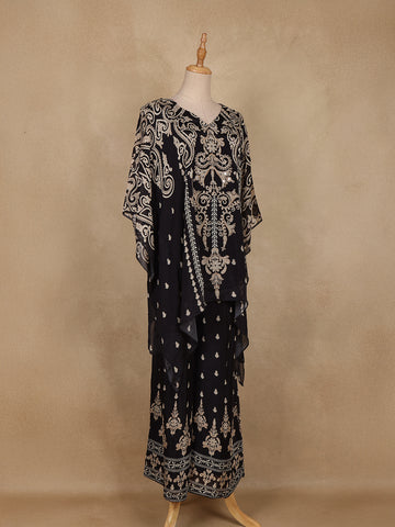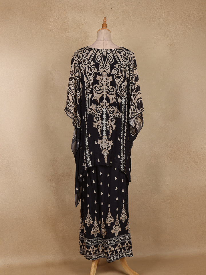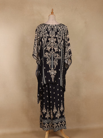 Breeze through celebrations with the effortless elegance of this Black Floral Printed Design Crepe Kaftan Suit. Crafted from luxurious crepe silk fabric, this ensemble offers a fluid drape and silky texture that enhances its graceful flow. The soft sky blue tone radiates calm sophistication, while the floral print adds a refreshing and feminine charm, perfect for summer soirées or festive gatherings.