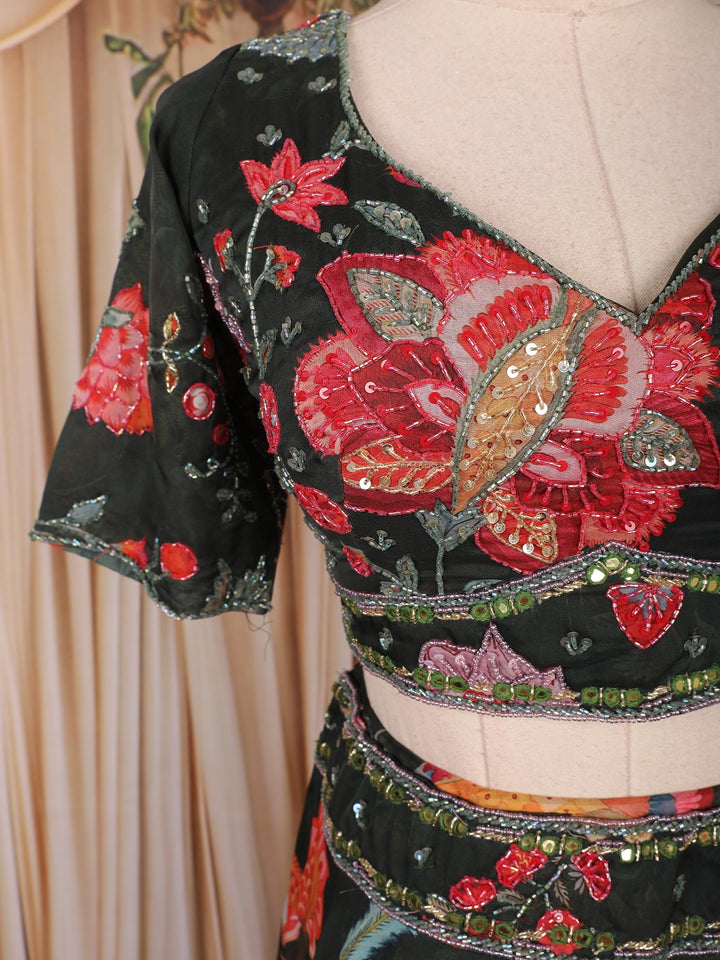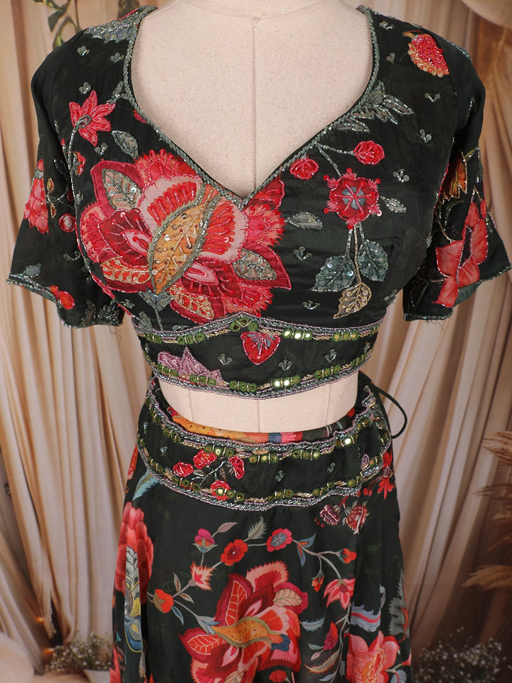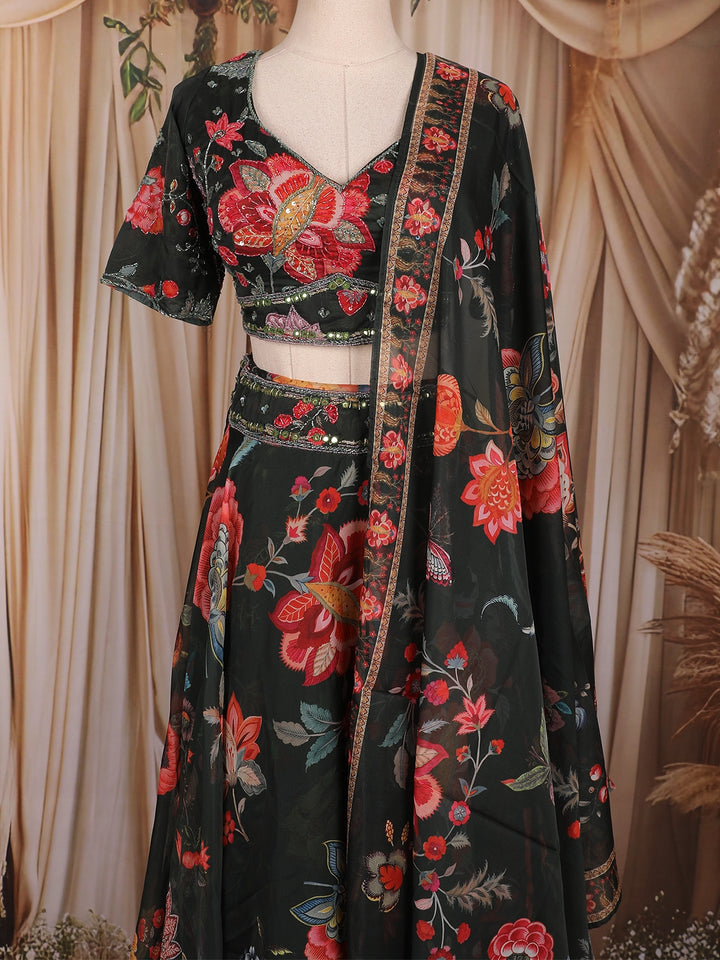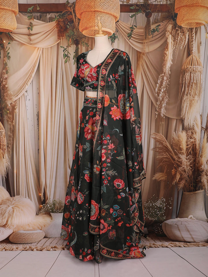 Black Floral Printed Organza Lehenga with Dupatta