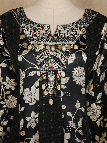 Grace your festive occasions with this Black Floral Printed Satin Gown, designed to capture elegance with a touch of contemporary charm. The gown features intricate mirror work and thread embroidery on the yoke, accentuated by a Notch Round neckline adorned with shells and antique coins, adding a hint of ethnic opulence.