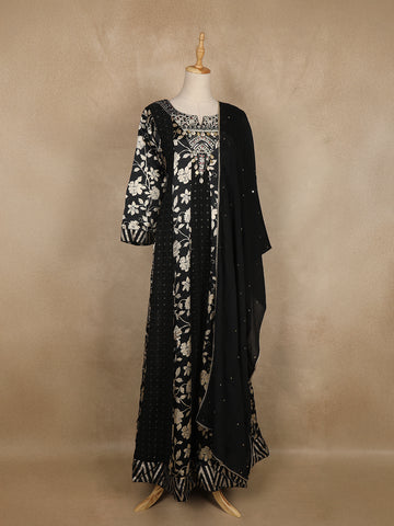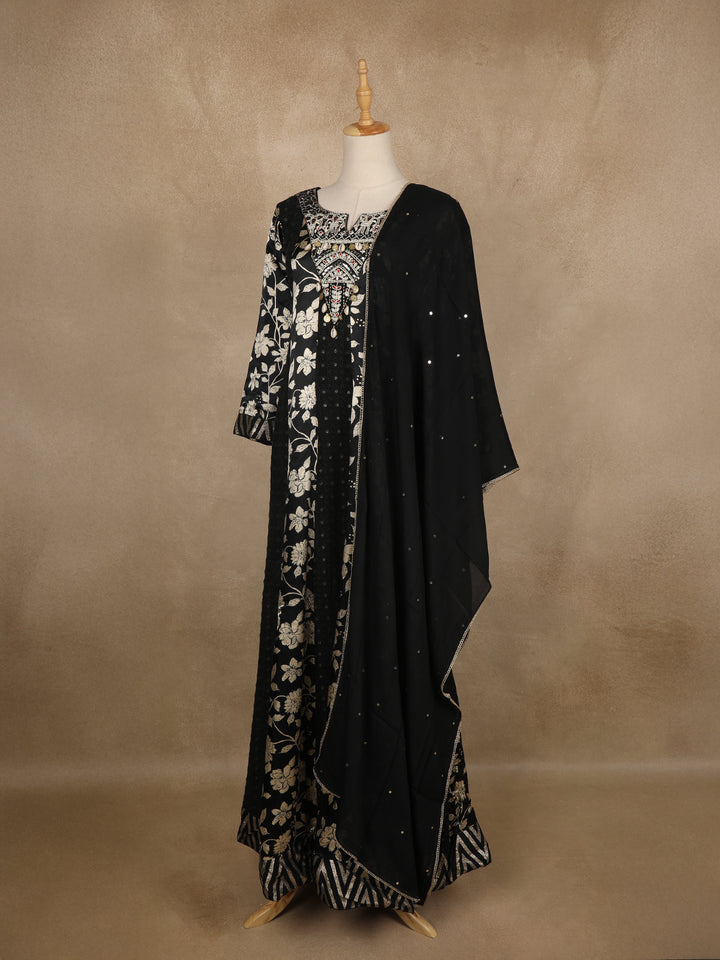 Black Floral Printed Satin Gown With Mirror Work Yoke And Dupatta