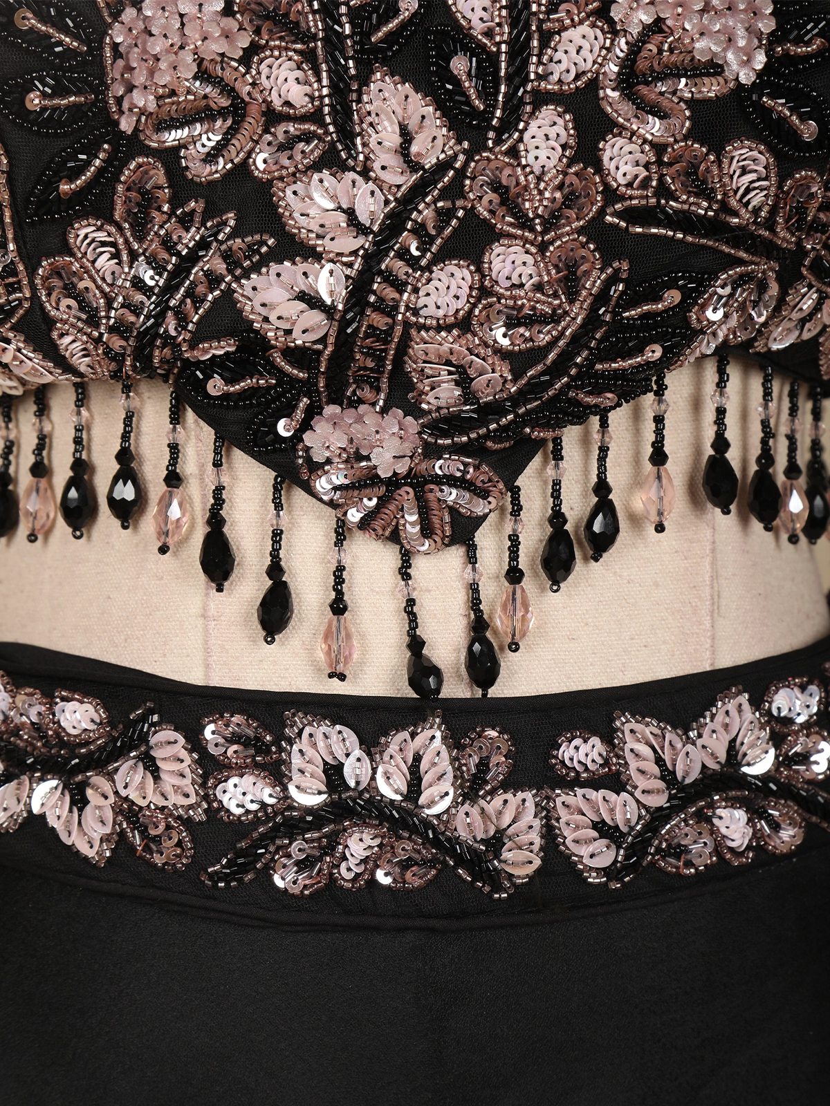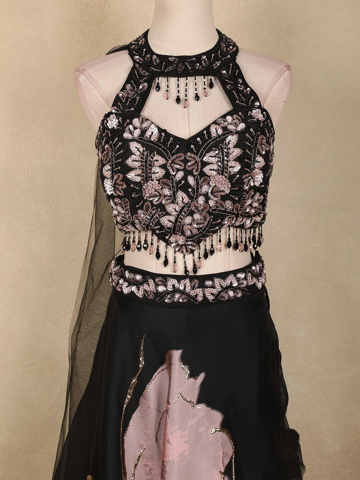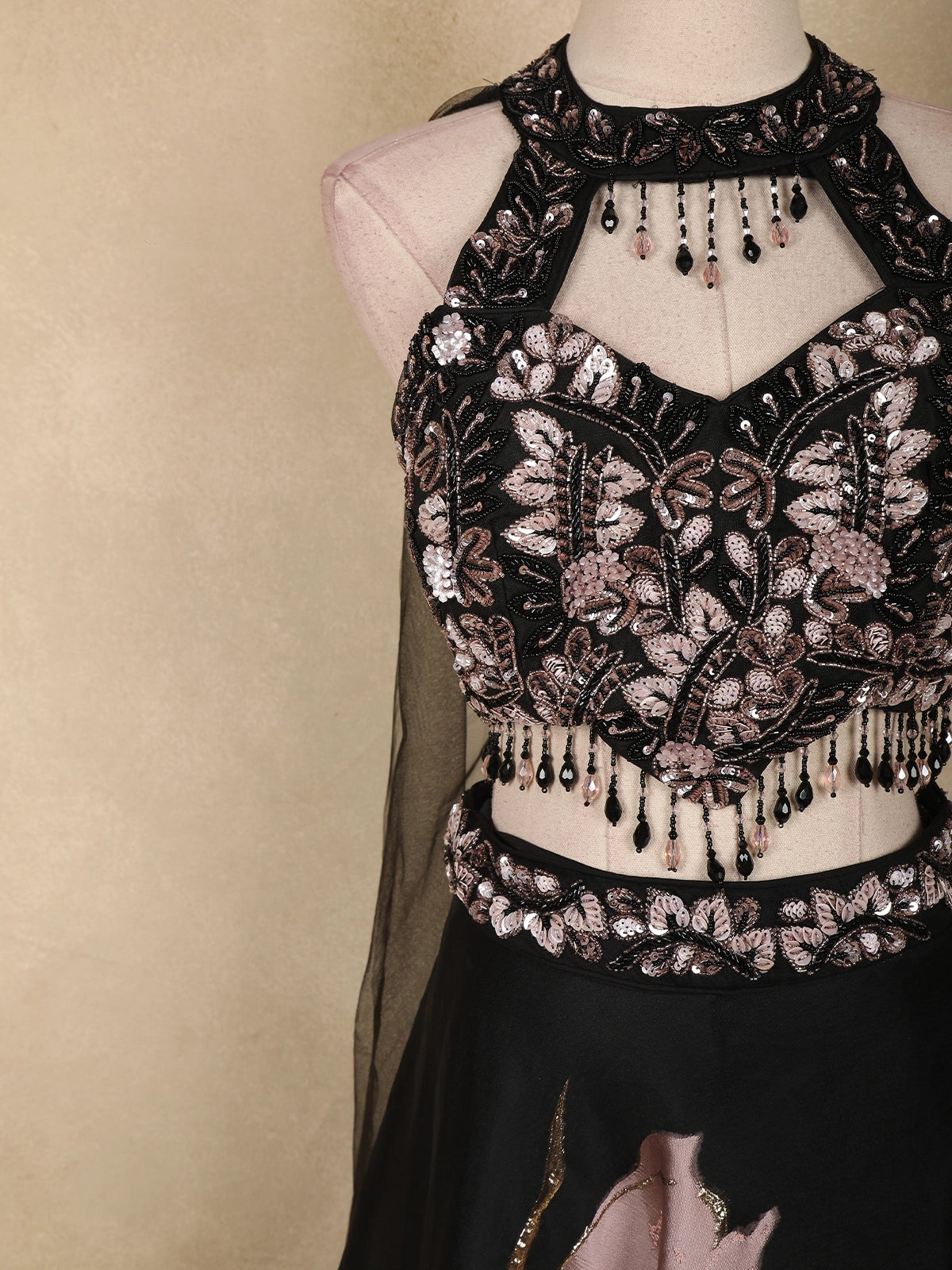 The net blouse is richly adorned with floral embroidery enhanced with sequins, beads, and cutdana work, creating a captivating shimmer. Styled with a high-neck halter silhouette and embellished choker neckline, the blouse features delicate tassel detailing along the hem, adding movement and a touch of modern flair.