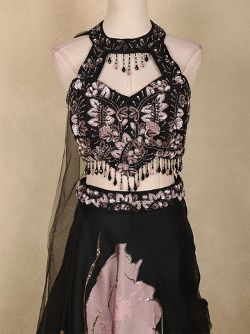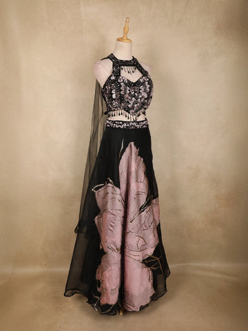 Turn heads at every celebration with this striking Black Net Party Wear Lehenga, crafted for bold elegance and contemporary glamour. Designed in a classic black base with soft blush-toned accents, this ensemble brings together dramatic contrast and refined detailing for a statement-making look.