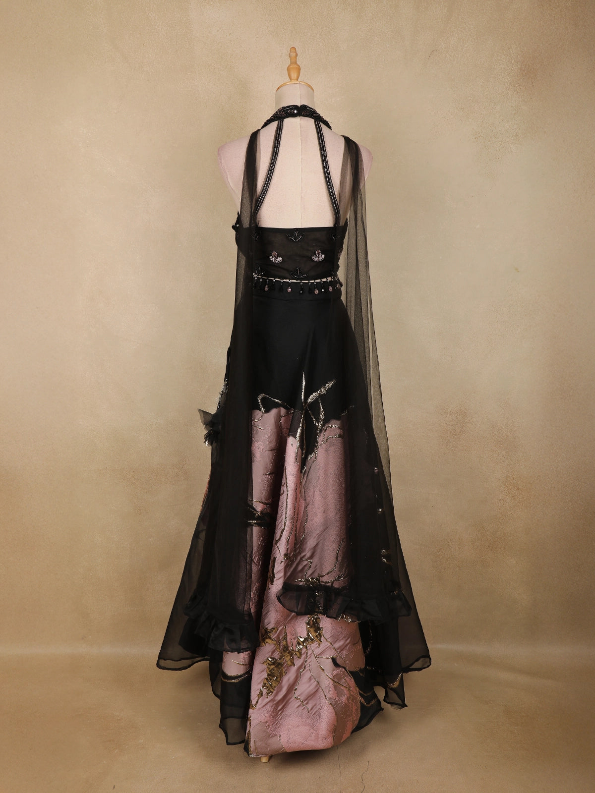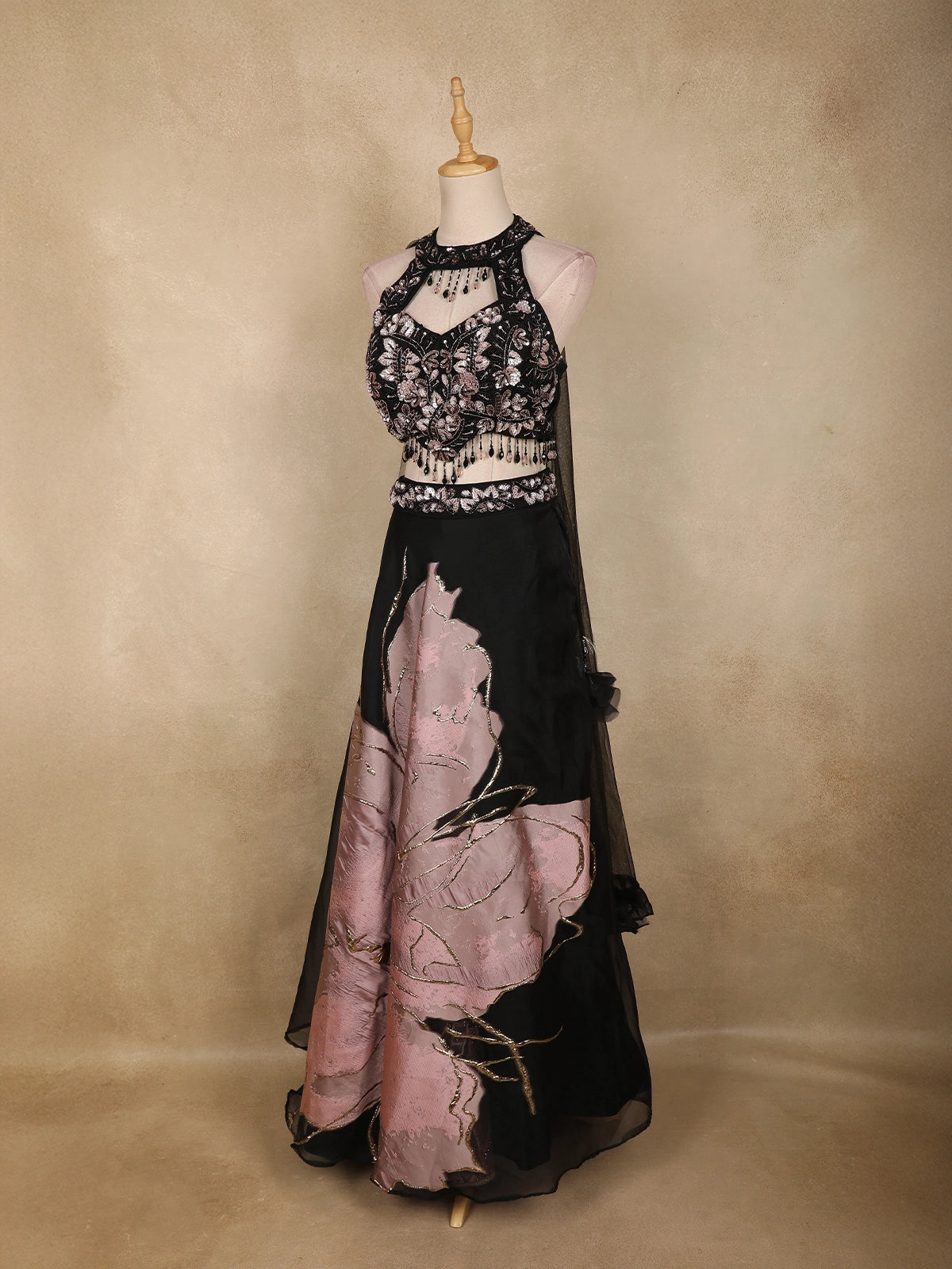Completing the ensemble is a sheer net dupatta that adds softness and balance to the dramatic silhouette. Ideal for cocktail parties, receptions, evening events, and festive celebrations, this lehenga is designed for those who love contemporary style with a luxurious edge.