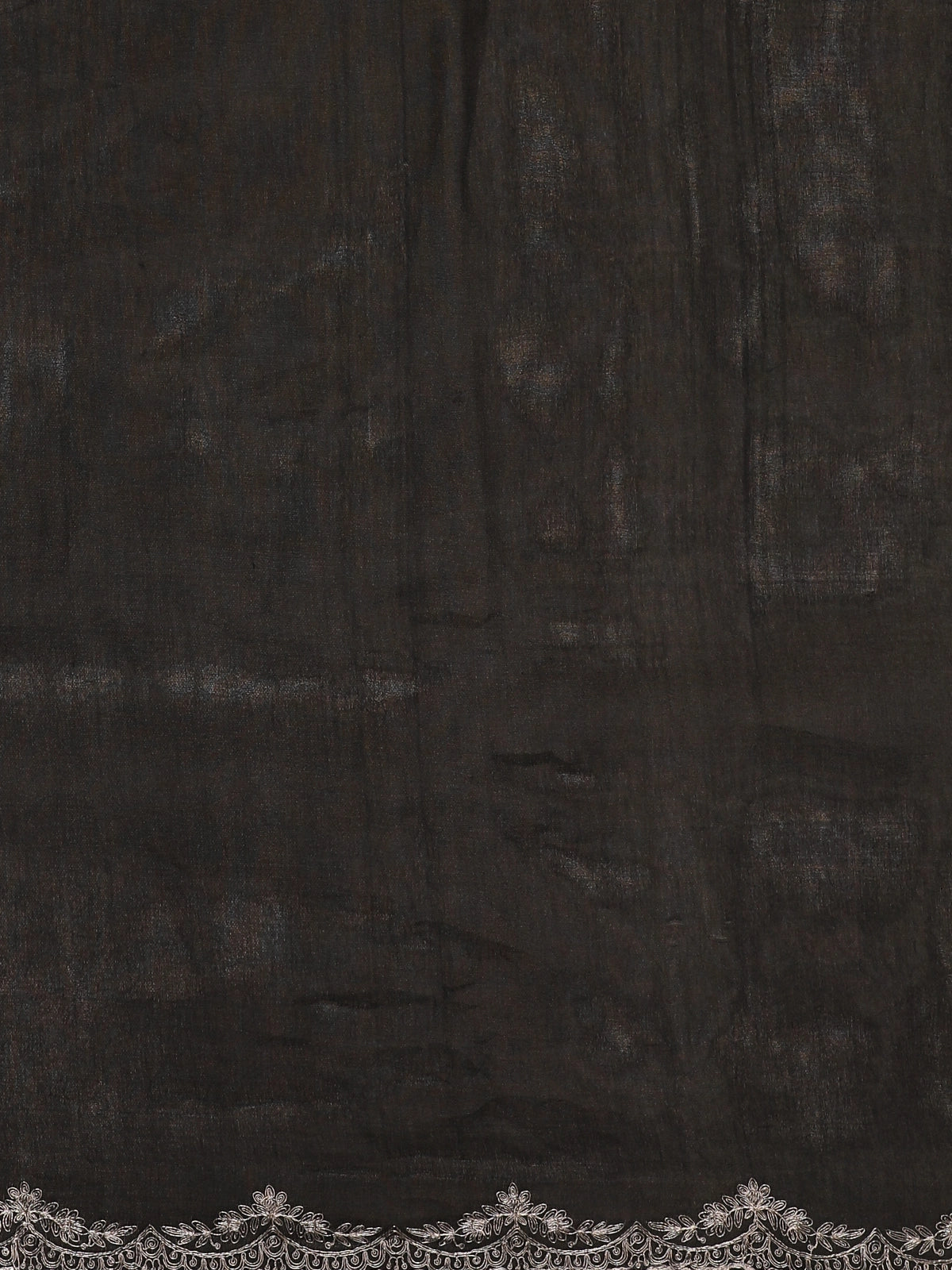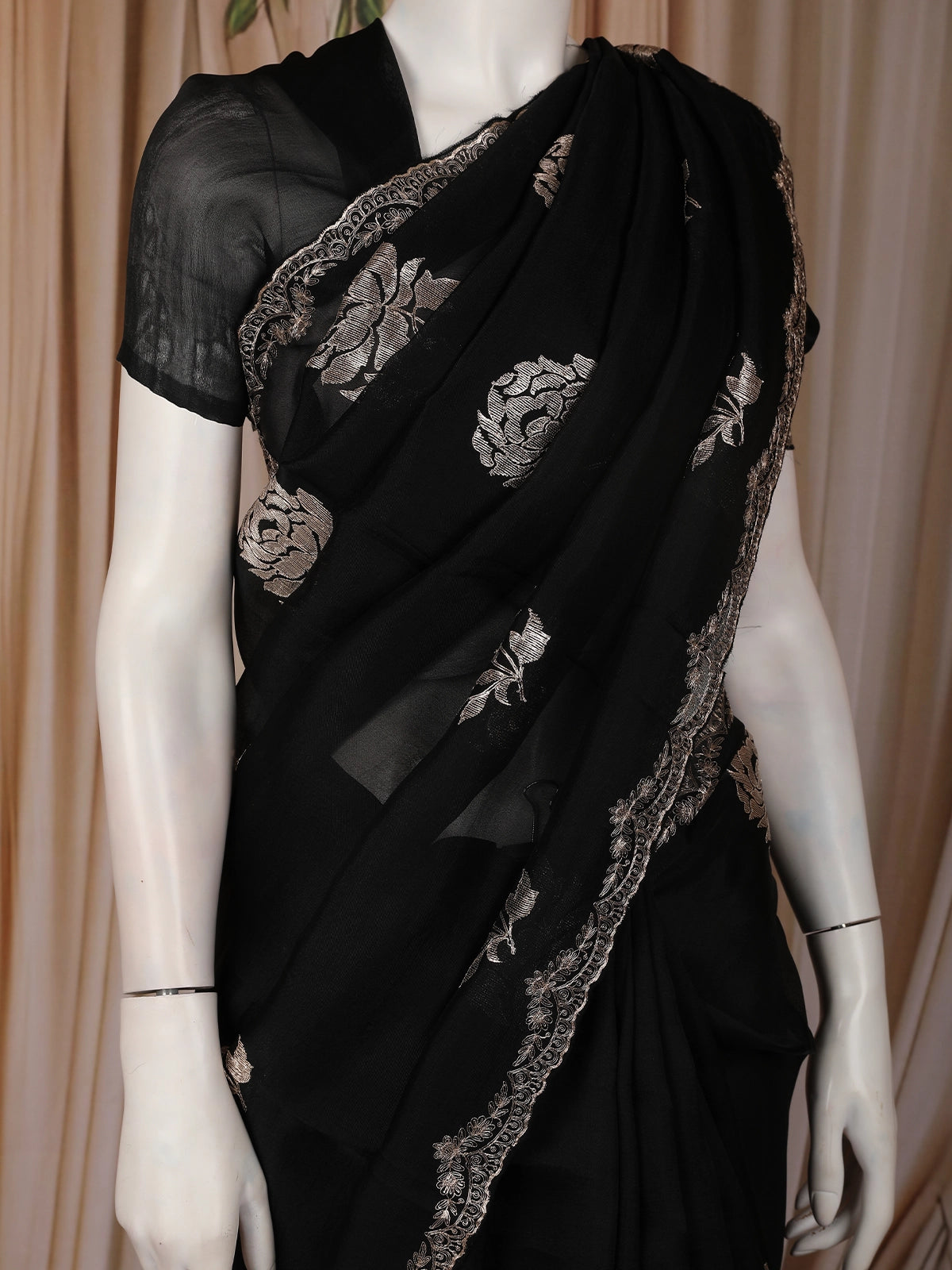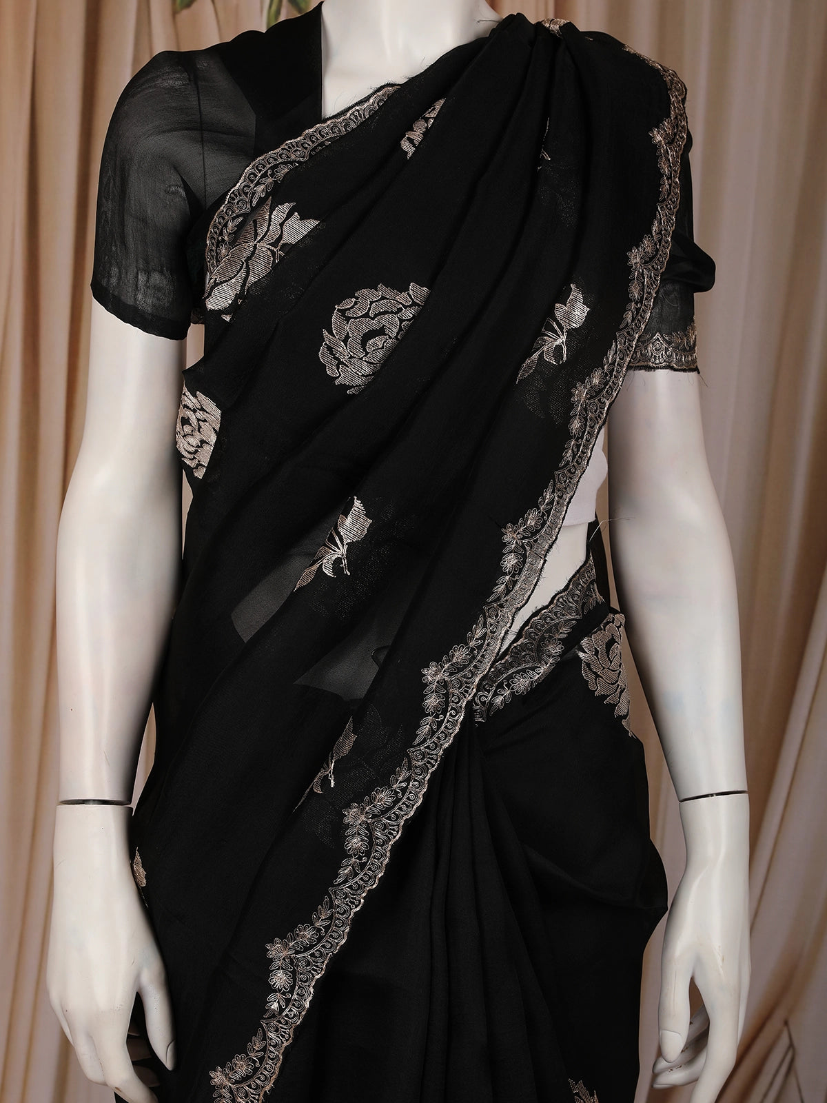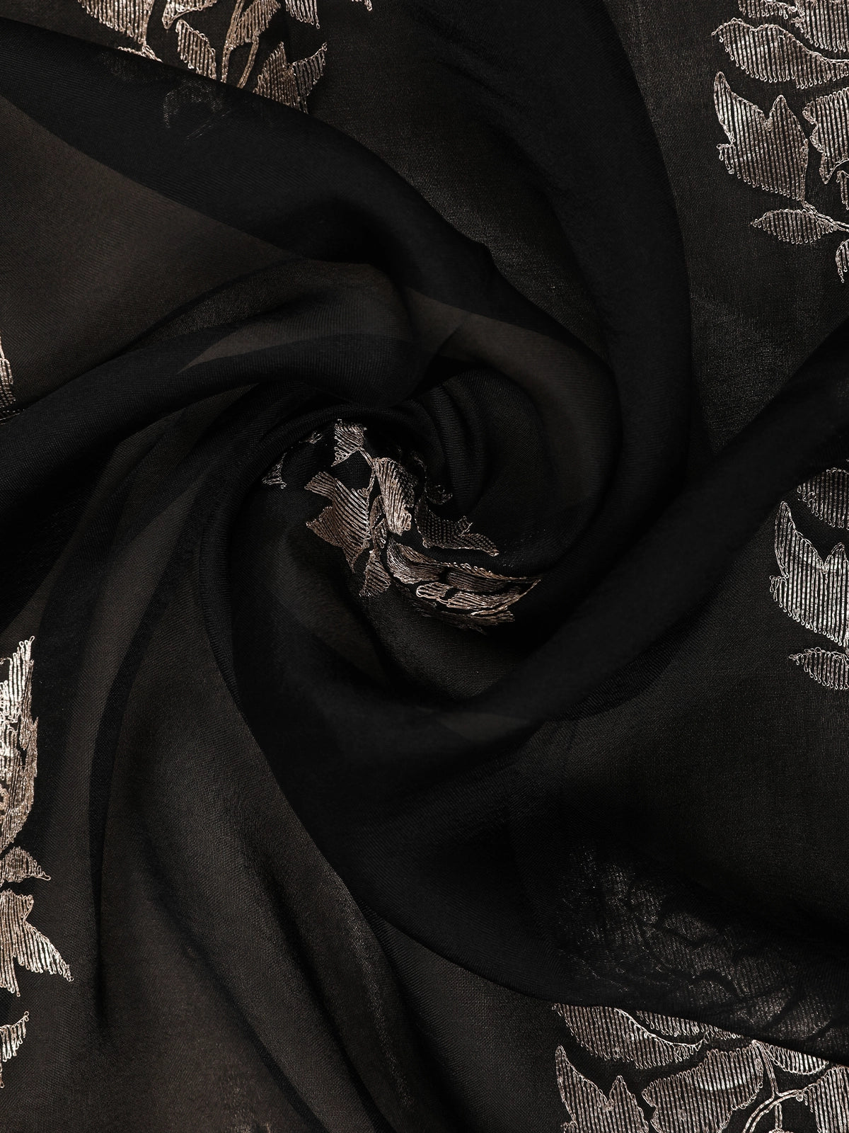 The body of the saree is beautifully enhanced with delicate floral thread embroidery, intricately placed to create a balanced and sophisticated look. The subtle contrast of the embroidery against the black backdrop adds depth and artistic charm without overpowering the elegance of the fabric. Finished with a finely detailed designer border, the saree exudes timeless appeal and graceful movement with every drape.