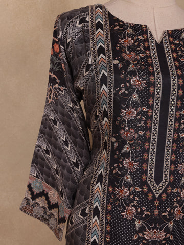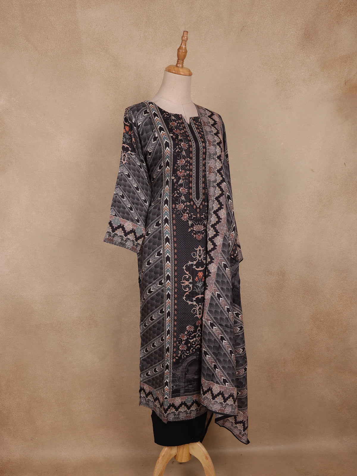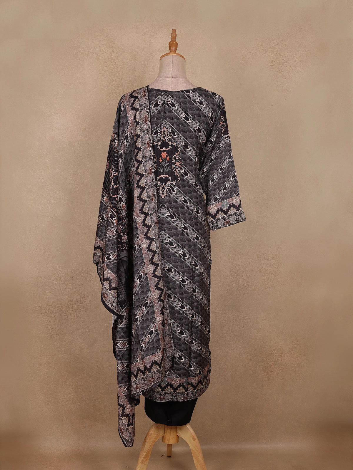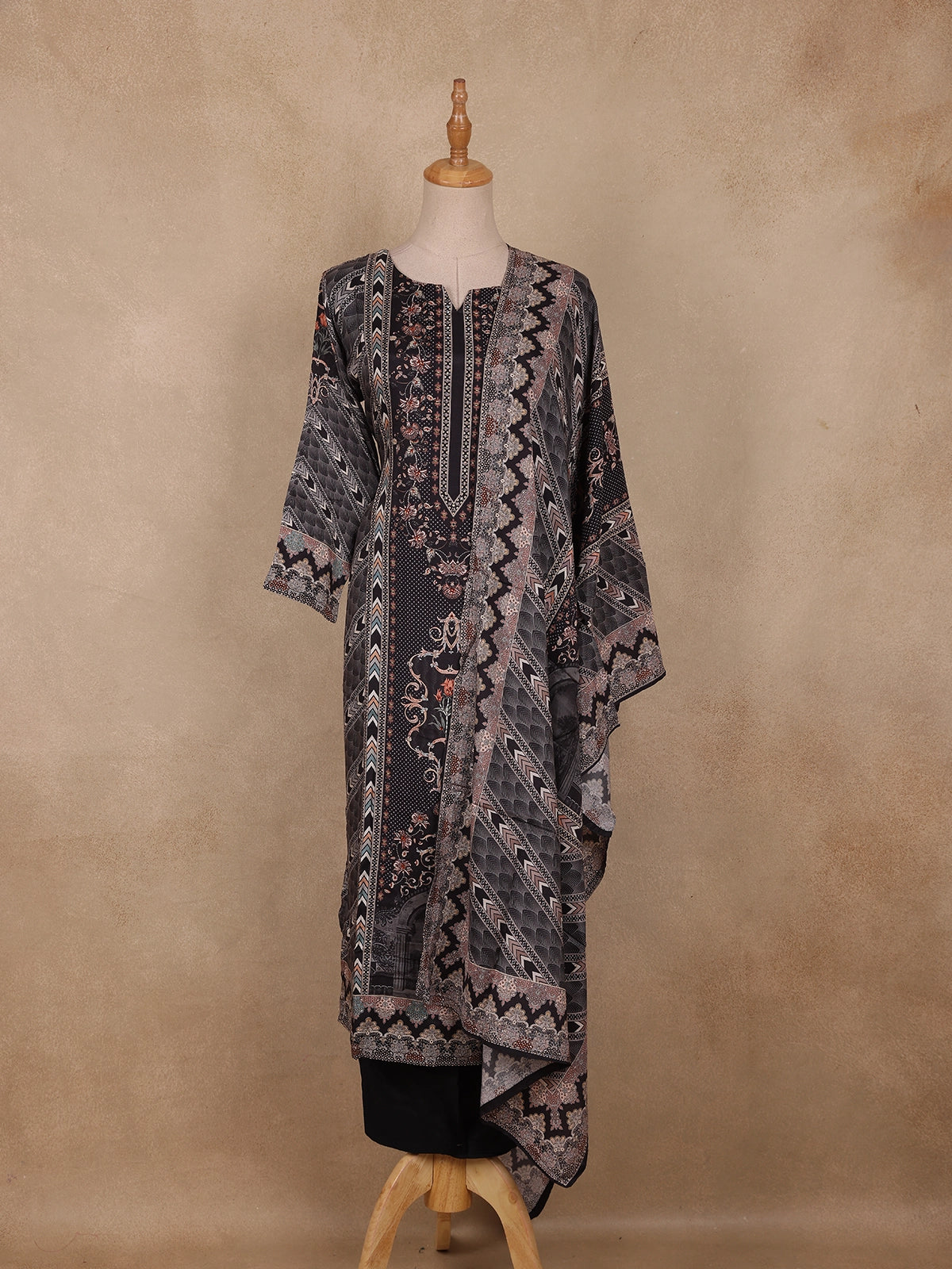 The round neckline with a notch detail and 3/4 sleeves add classic simplicity, while the straight-cut silhouette ensures a sleek and flattering fit for all body types. The outfit is complemented by a matching printed dupatta, detailed with bold zigzag and border patterns that enhance its visual appeal.
