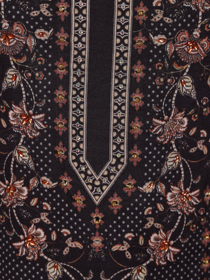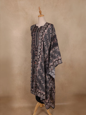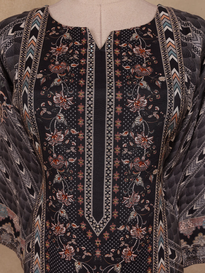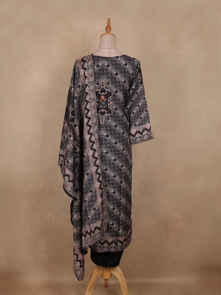 Redefine understated elegance with this Black Geometric Printed Cotton Straight-Cut Salwar Suit, a chic and versatile addition to your ethnic collection. Crafted from premium-quality cotton fabric, this ensemble features a stunning interplay of geometric and floral motifs in contrasting shades of grey and subtle rose, giving it a refined, artistic touch.
