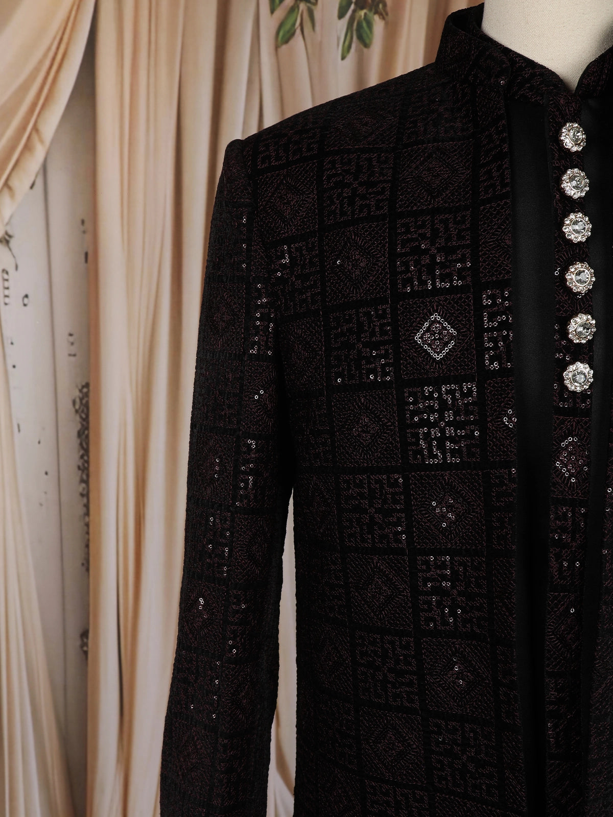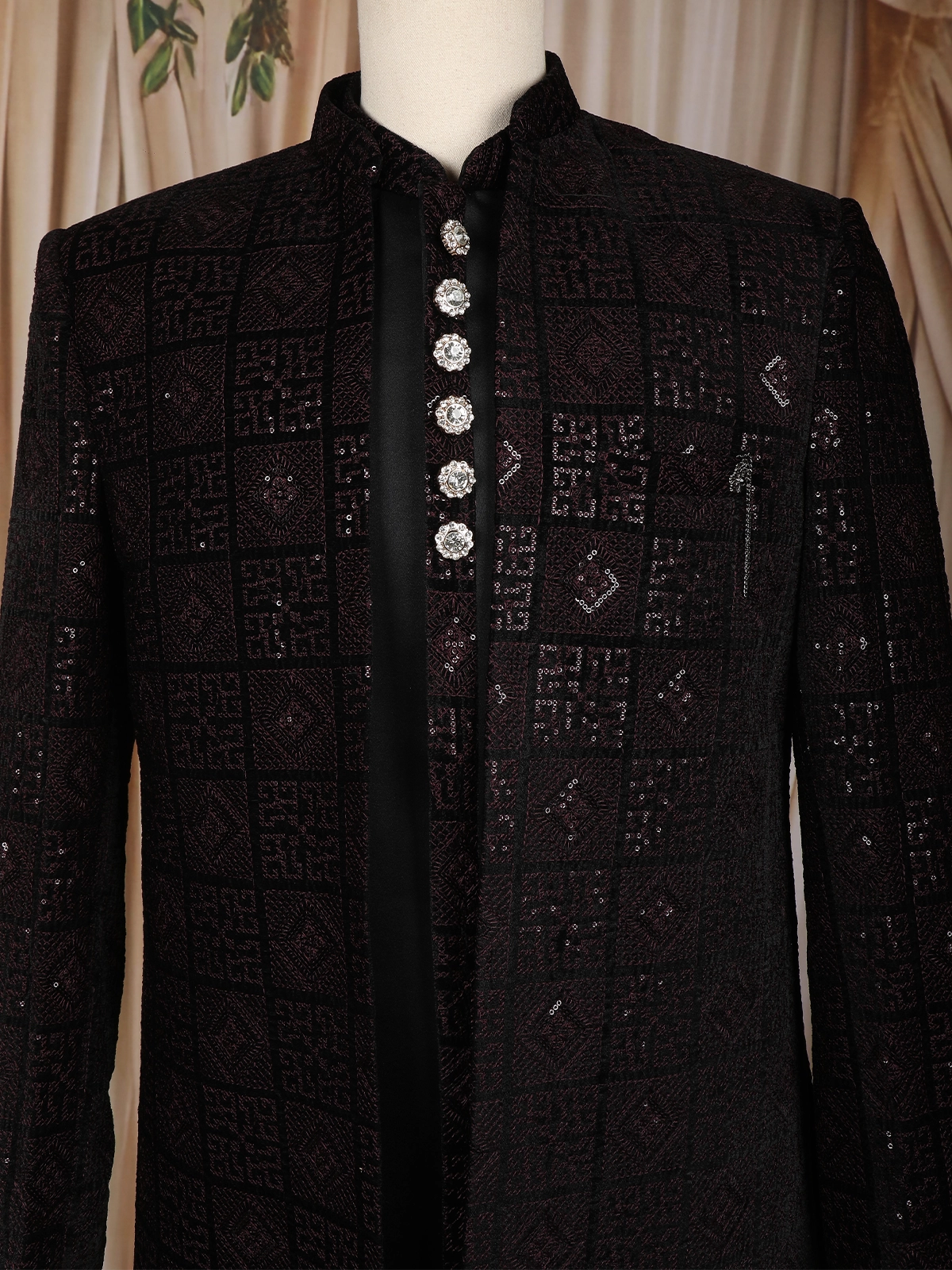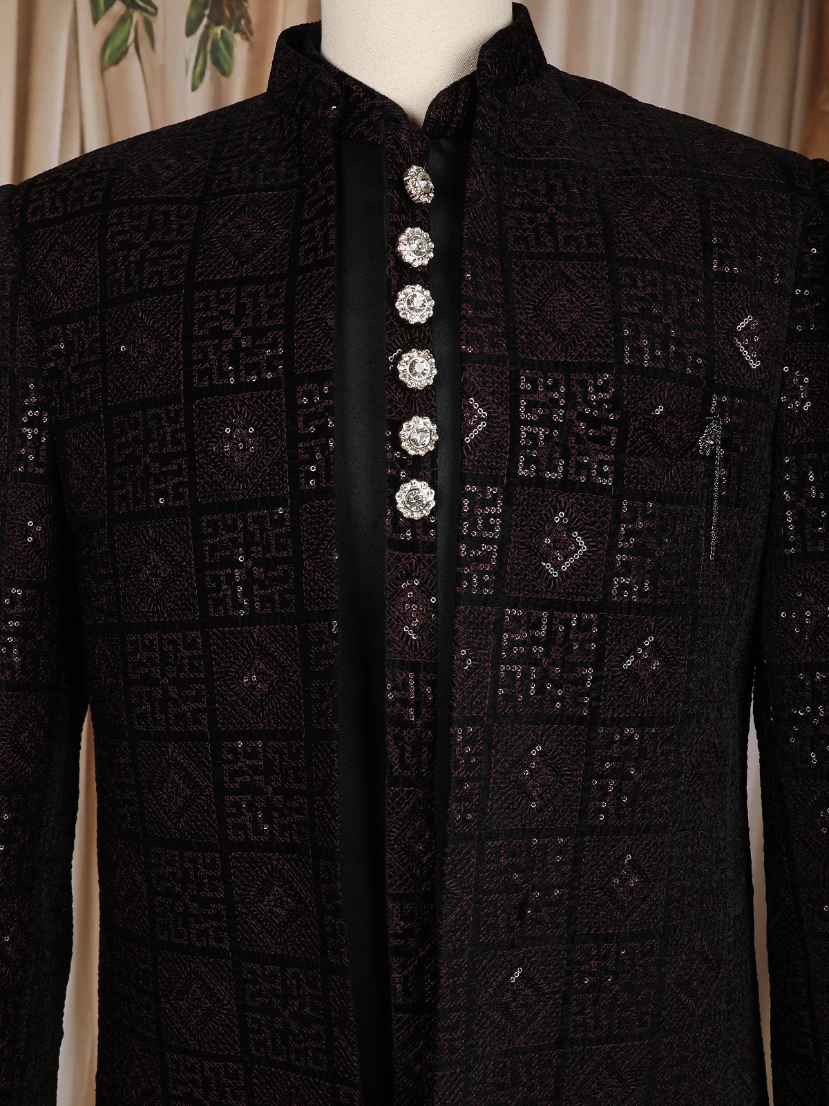 A sleek stand collar and a contrasting black front panel elevate the ensemble, perfectly complemented by premium crystal-finish designer buttons that add a royal charm to the attire. The longline cut offers a modern and refined appeal, making it ideal for receptions, sangeet nights, and grand celebrations.