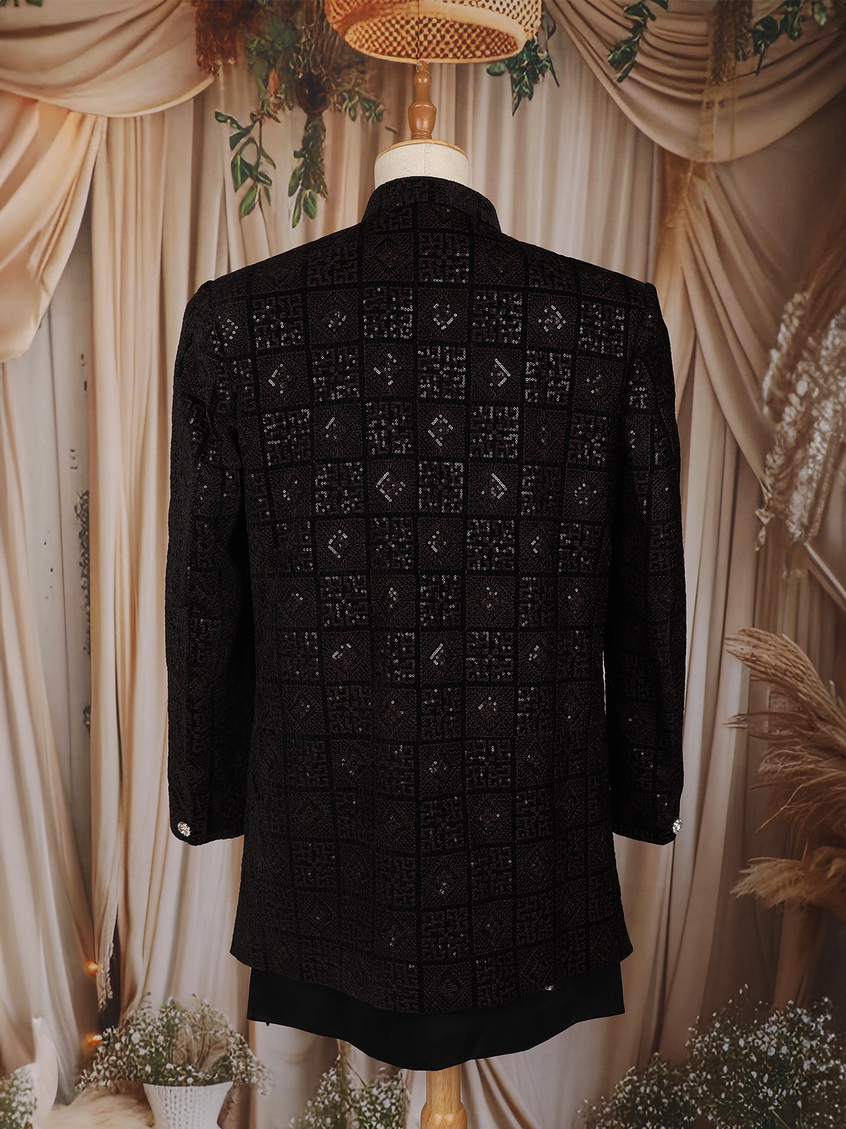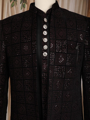 Make a powerful style statement with this elegant black Indo-Western sherwani, crafted for grooms and special occasions. The outfit features an all-over geometric embroidered pattern highlighted with finely placed sequins, giving it a subtle yet sophisticated shimmer. The textured grid design adds depth and richness, while the structured silhouette enhances the wearer’s overall look.