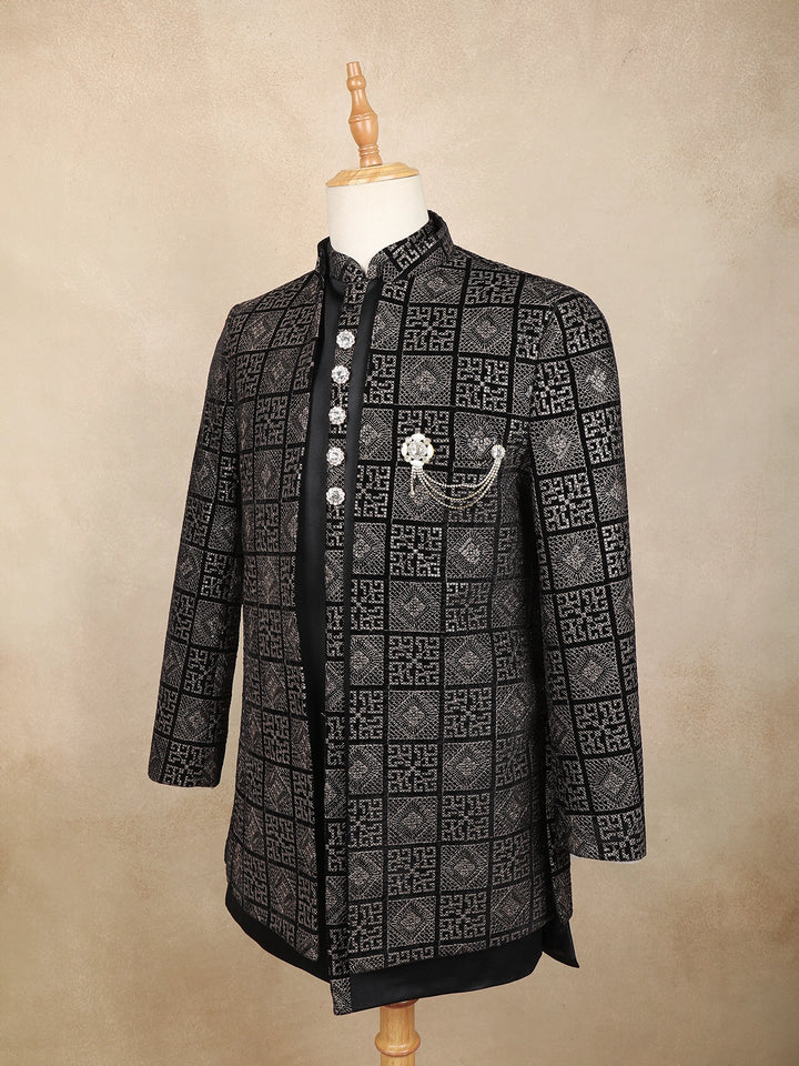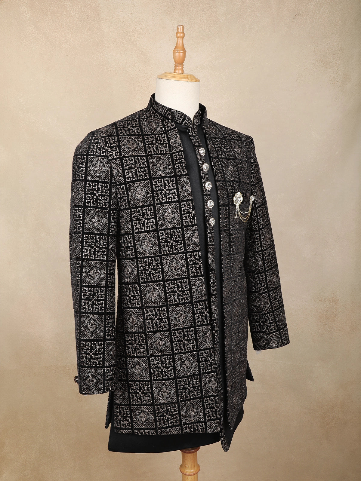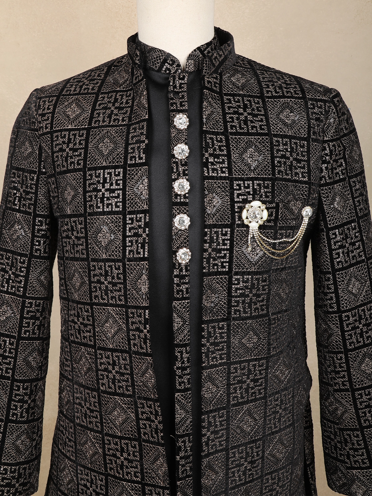 Black Geometric Thread Embroidered Design Velvet Indo-Western Sherwani Set with Brooch