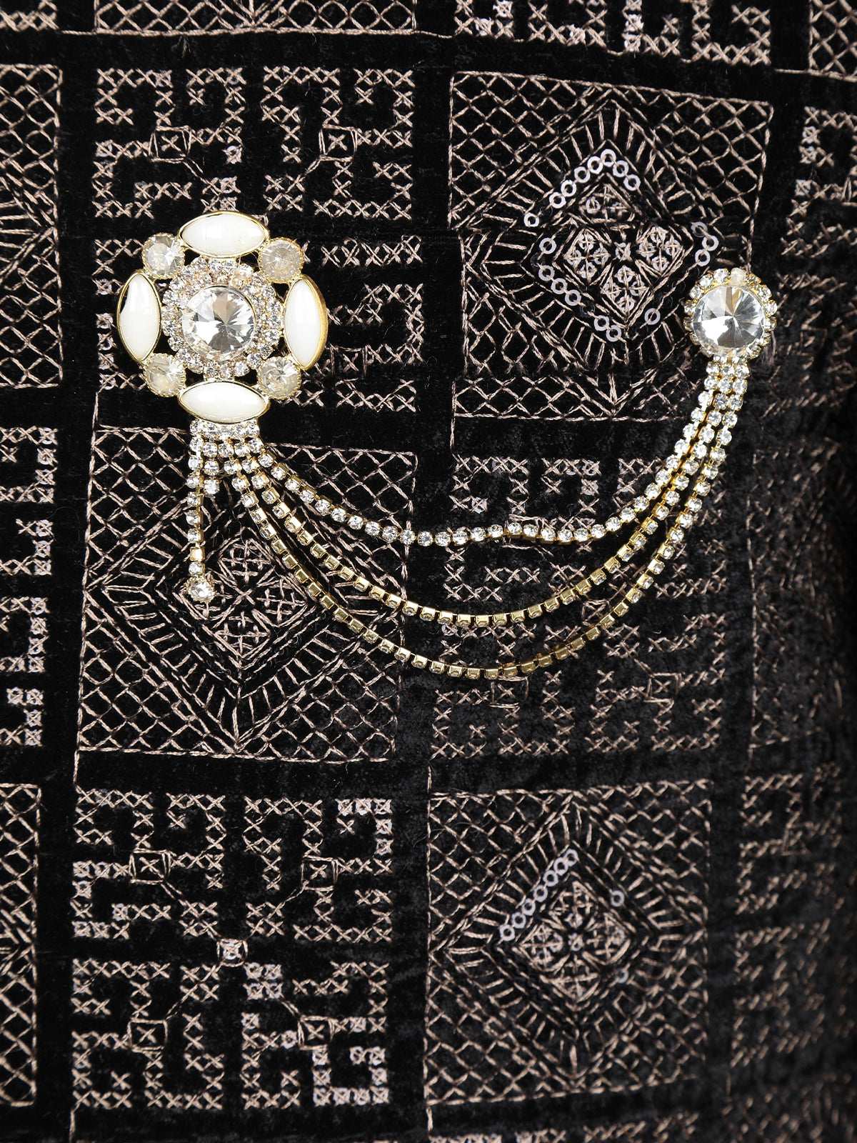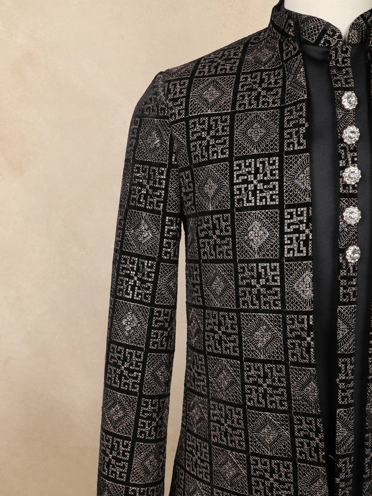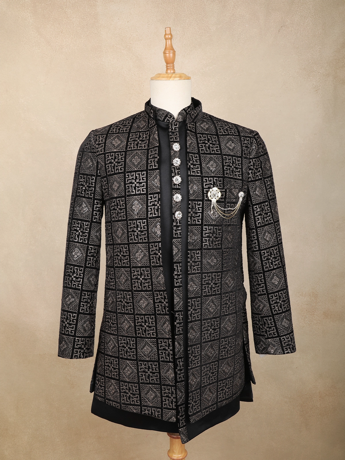 Black Geometric Thread Embroidered Design Velvet Indo-Western Sherwani Set with Brooch