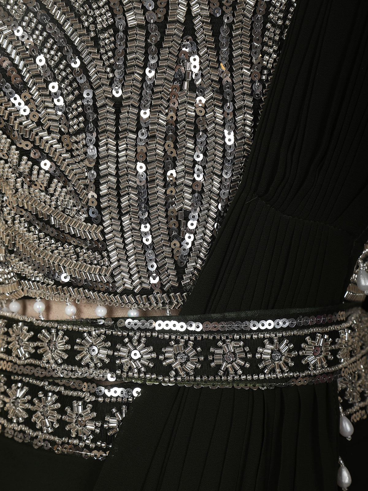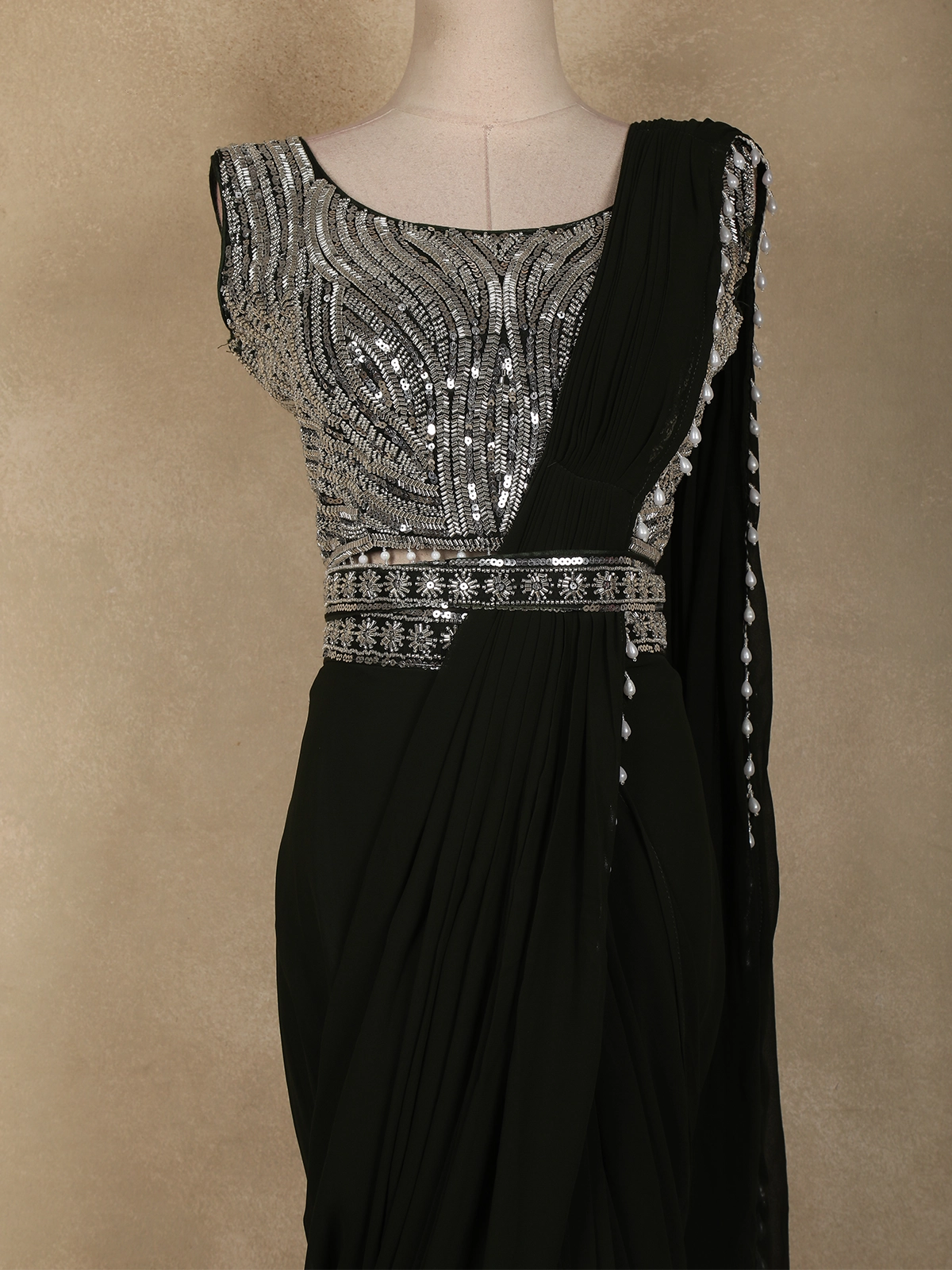 Adding definition to the look is a beautifully embroidered waist belt, detailed with delicate sequin motifs that cinch the waist and elevate the overall structure of the saree. The pre-draped georgette saree flows seamlessly from the waist, creating a sleek and flattering drape. The pallu is accented with pearl drop embellishments, adding subtle movement and refined charm.