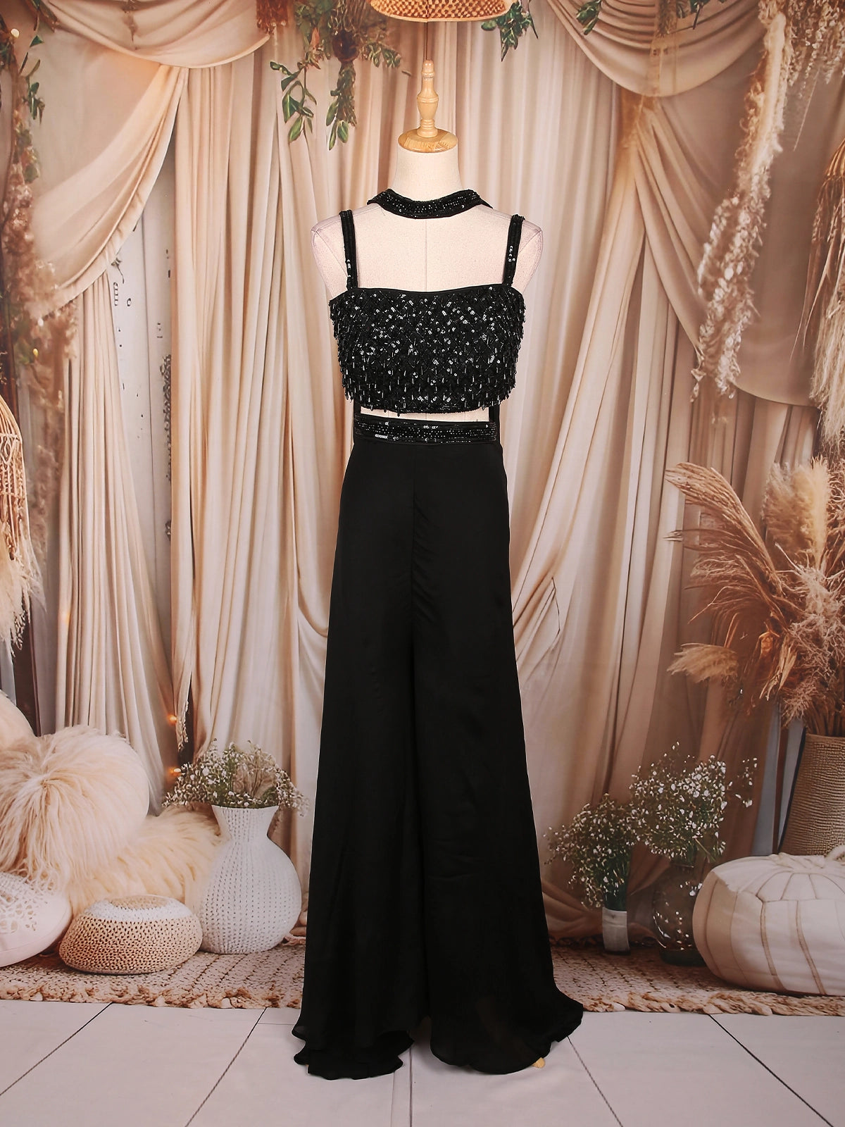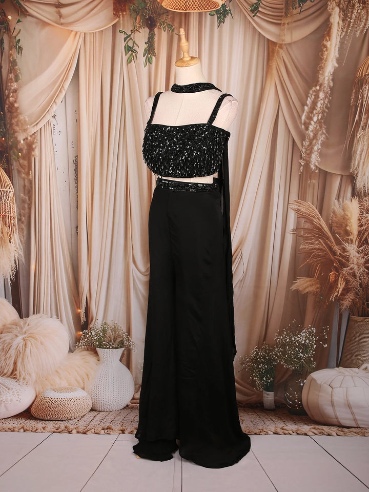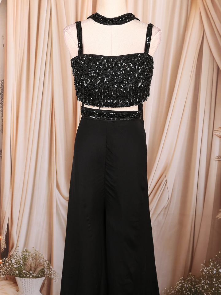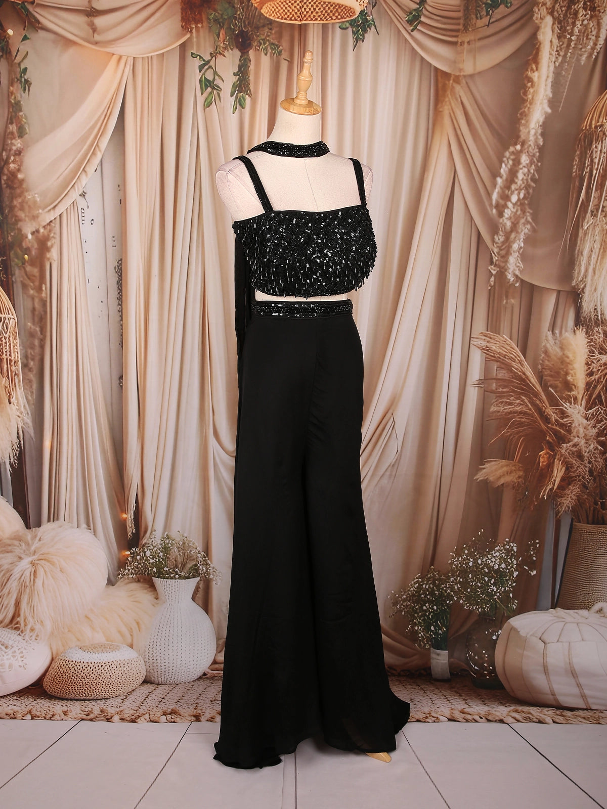 Unleash your inner diva with this Black Georgette Palazzo Suit, a perfect combination of bold elegance and contemporary glamour. The outfit features a stunning sequins-embroidered crop top, intricately designed with heavy sequin and beadwork that sparkles beautifully under the light. The top’s strappy silhouette adds a modern edge, making it an ideal pick for evening parties and festive occasions.