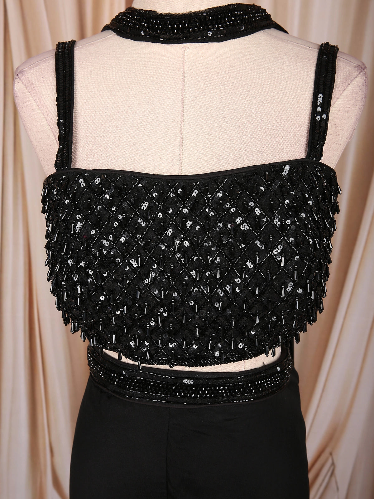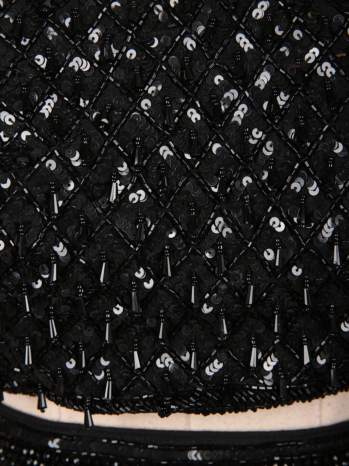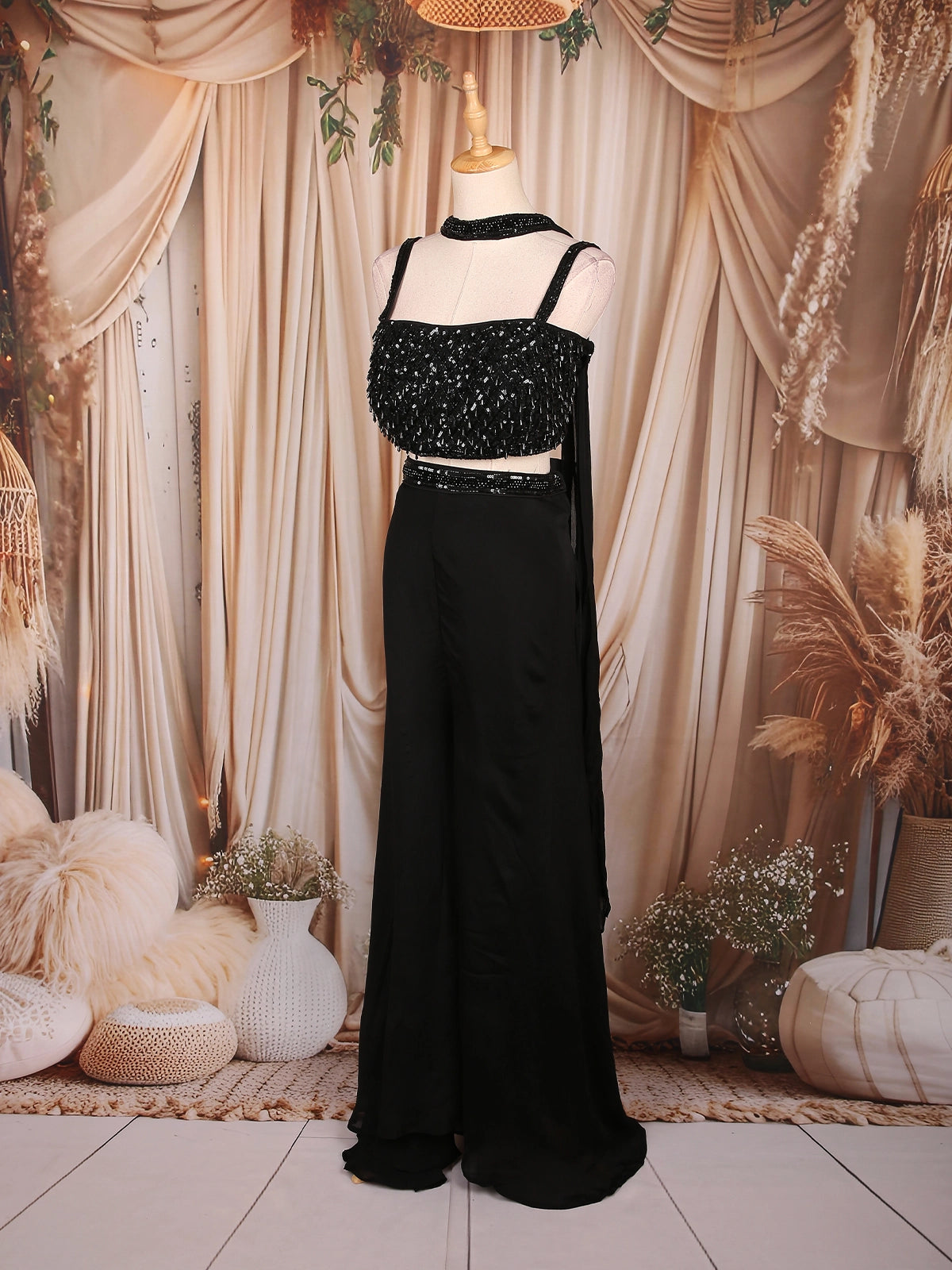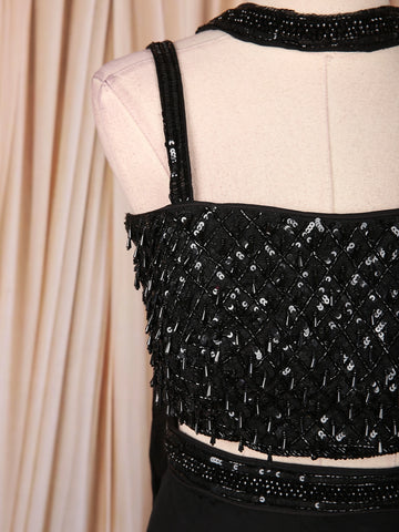 Unleash your inner diva with this Black Georgette Palazzo Suit, a perfect combination of bold elegance and contemporary glamour. The outfit features a stunning sequins-embroidered crop top, intricately designed with heavy sequin and beadwork that sparkles beautifully under the light. The top’s strappy silhouette adds a modern edge, making it an ideal pick for evening parties and festive occasions.