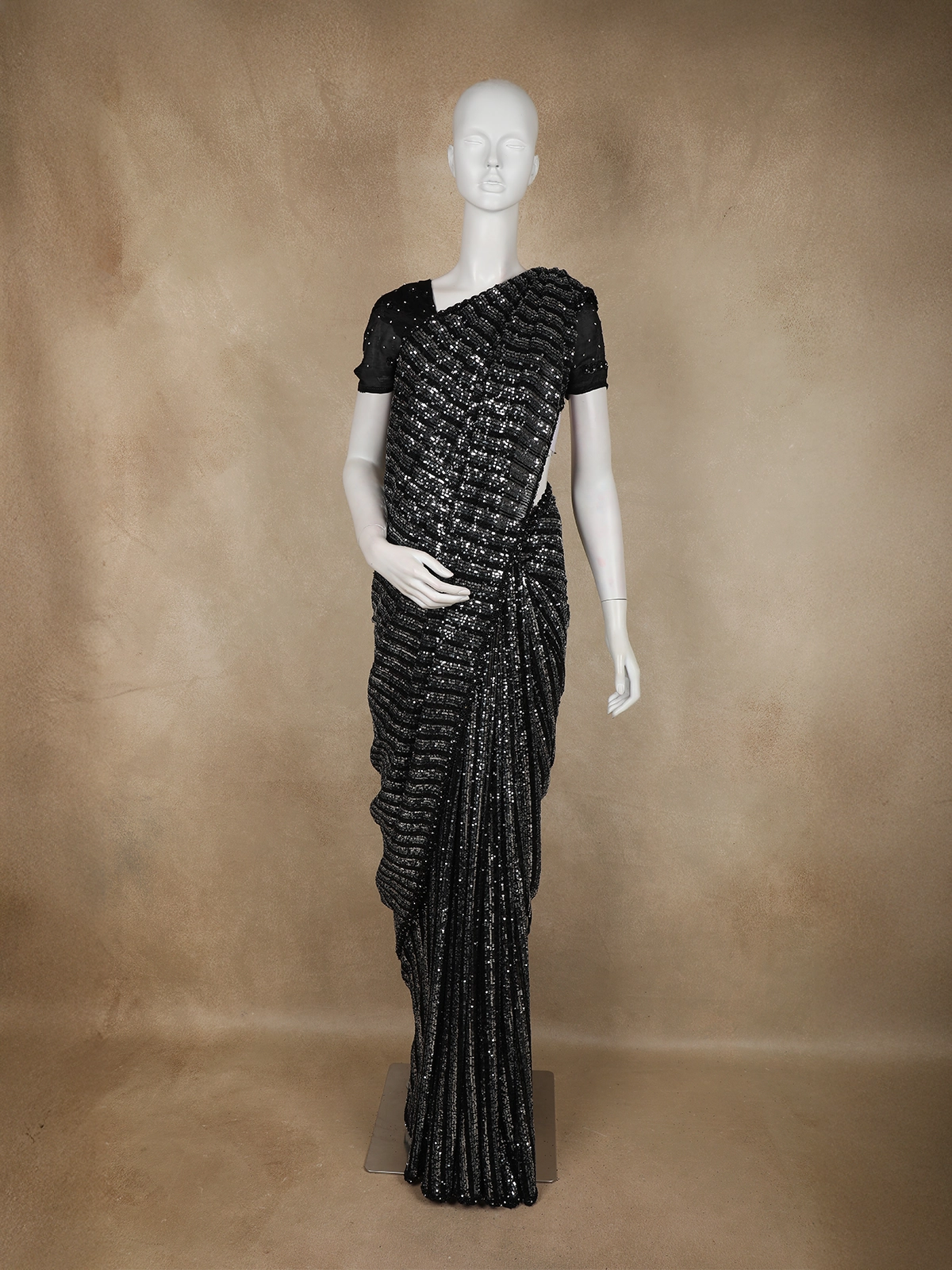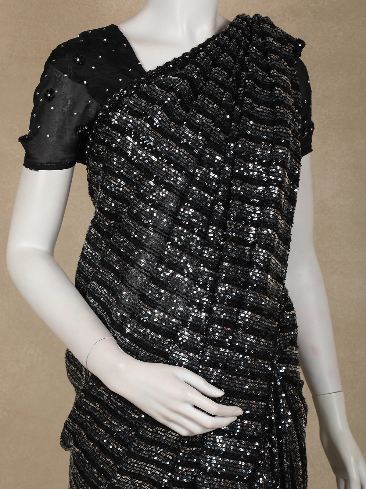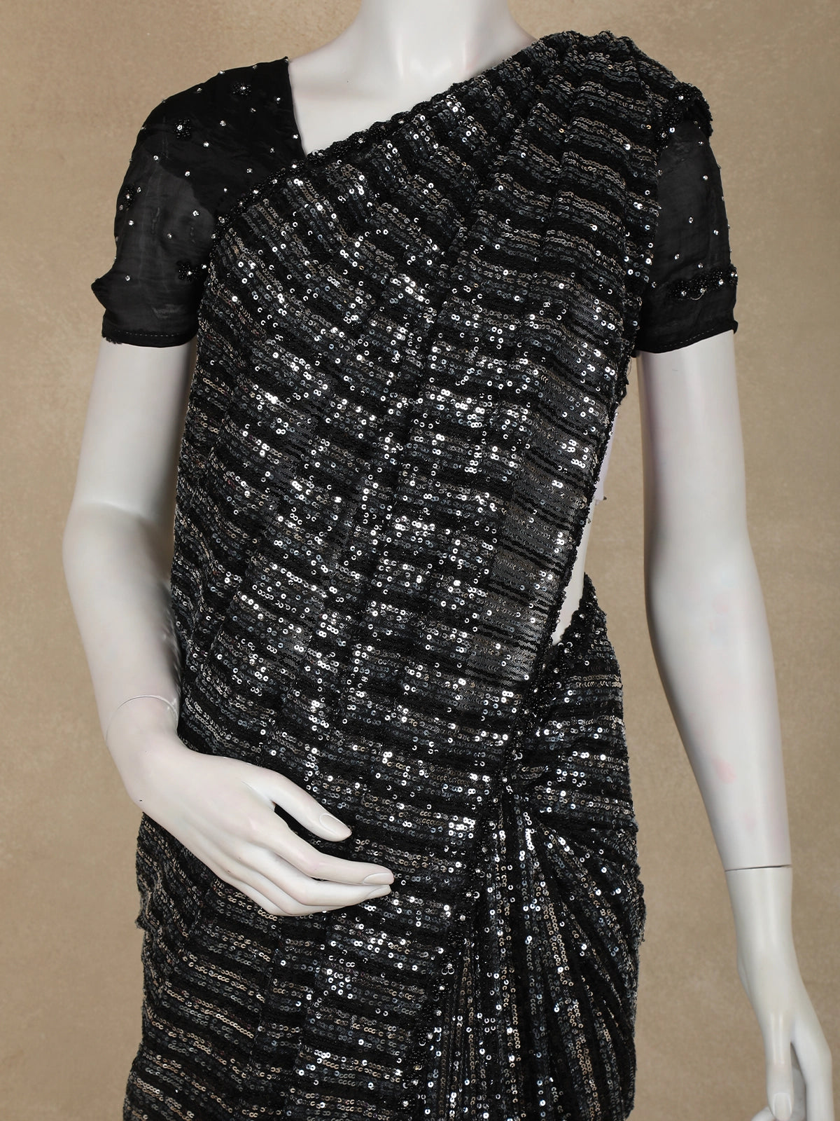 Paired with a matching black blouse, this saree is an excellent choice for evening parties, cocktail events, receptions, festive celebrations, and special occasions, making it a standout addition to any contemporary ethnic wardrobe.
