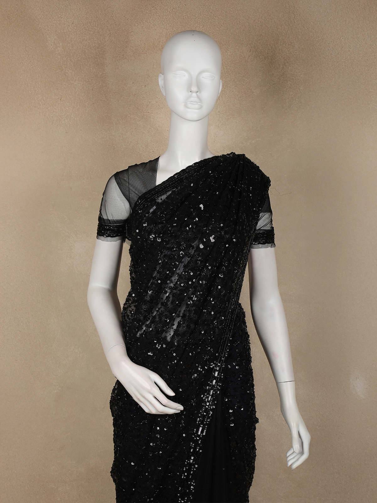 Paired with a matching black blouse, this saree is an excellent choice for evening parties, cocktail events, receptions, festive celebrations, and special occasions, making it a standout addition to any contemporary ethnic wardrobe.