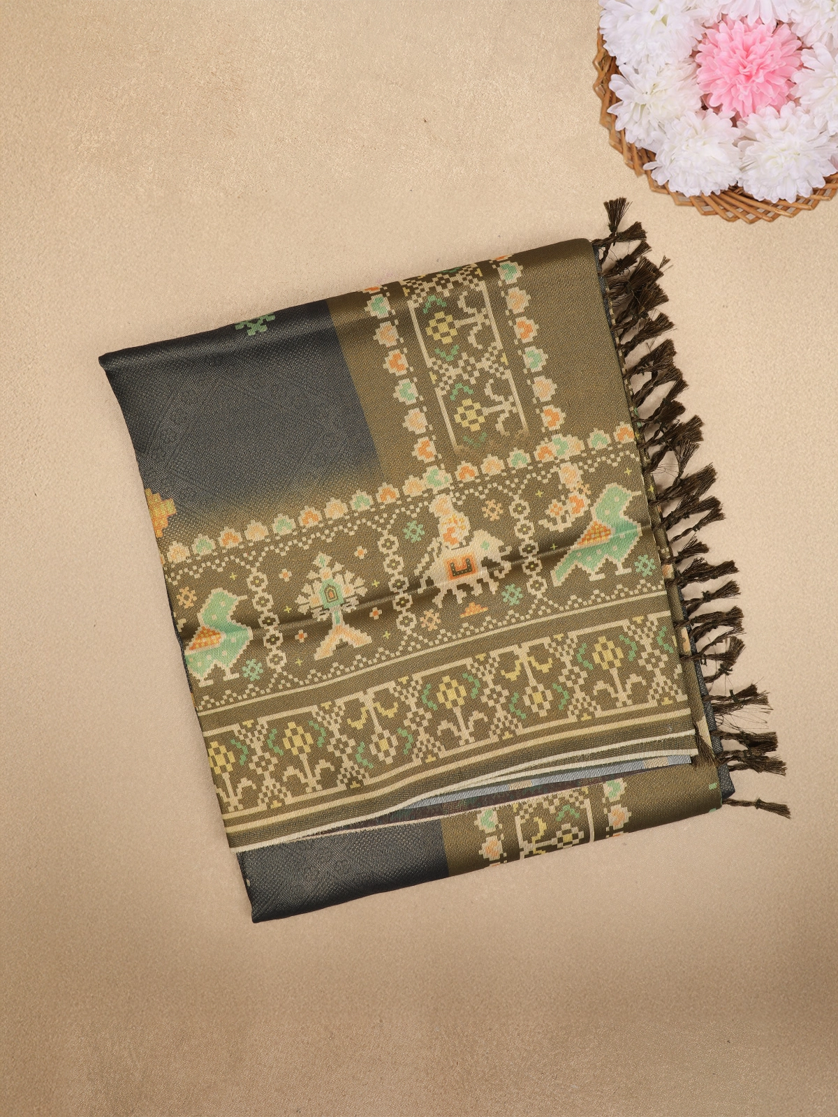 Black Ikat Woven Art Silk Saree with Contrast Olive Green Border