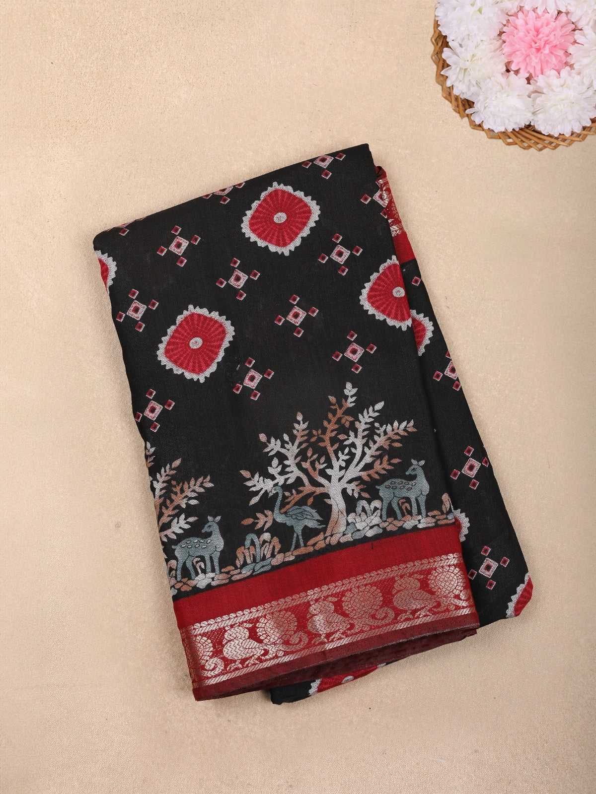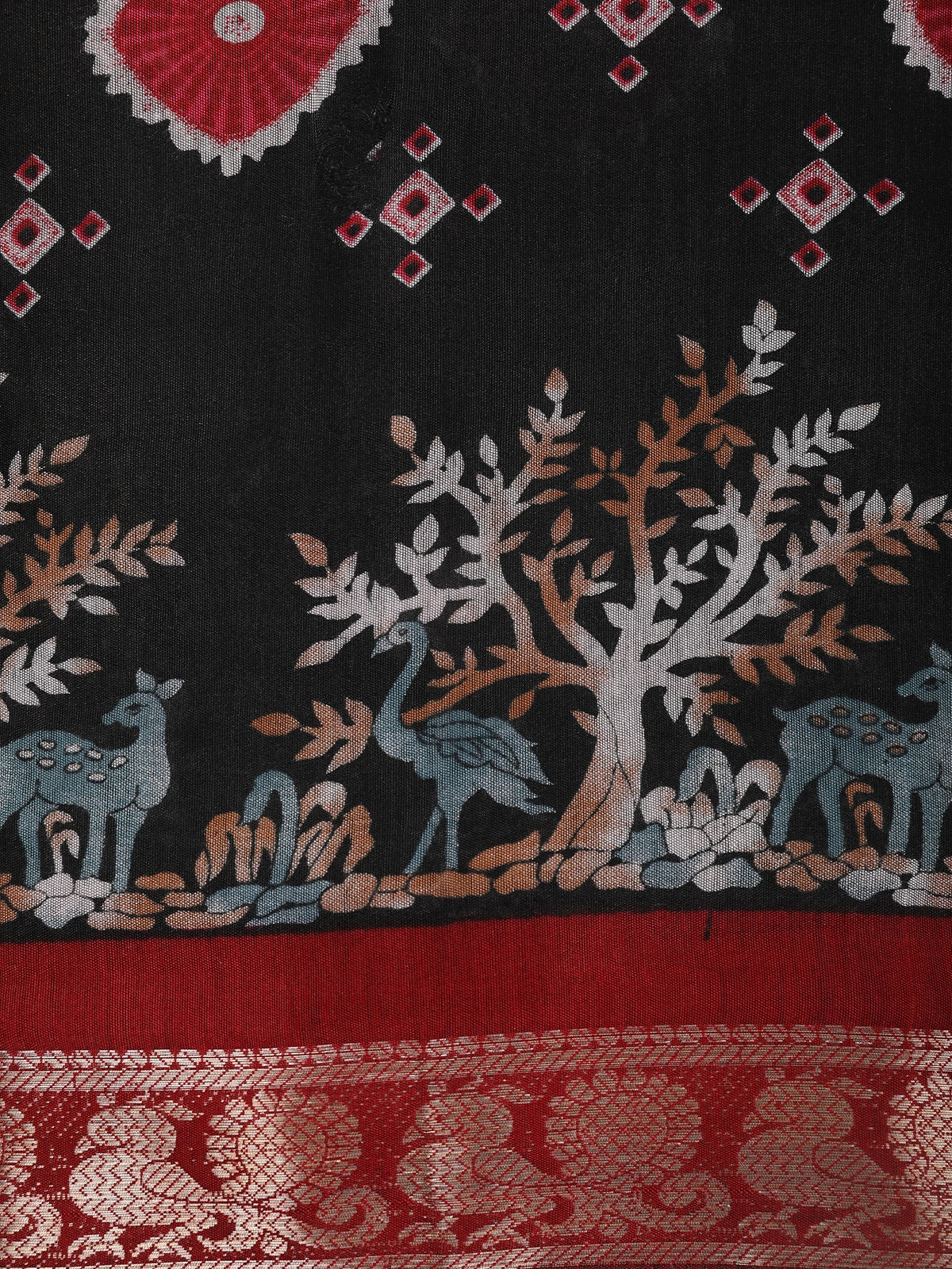 Black Kalamkari Forest Theme Printed Chanderi Cotton Saree with Red Zari Border