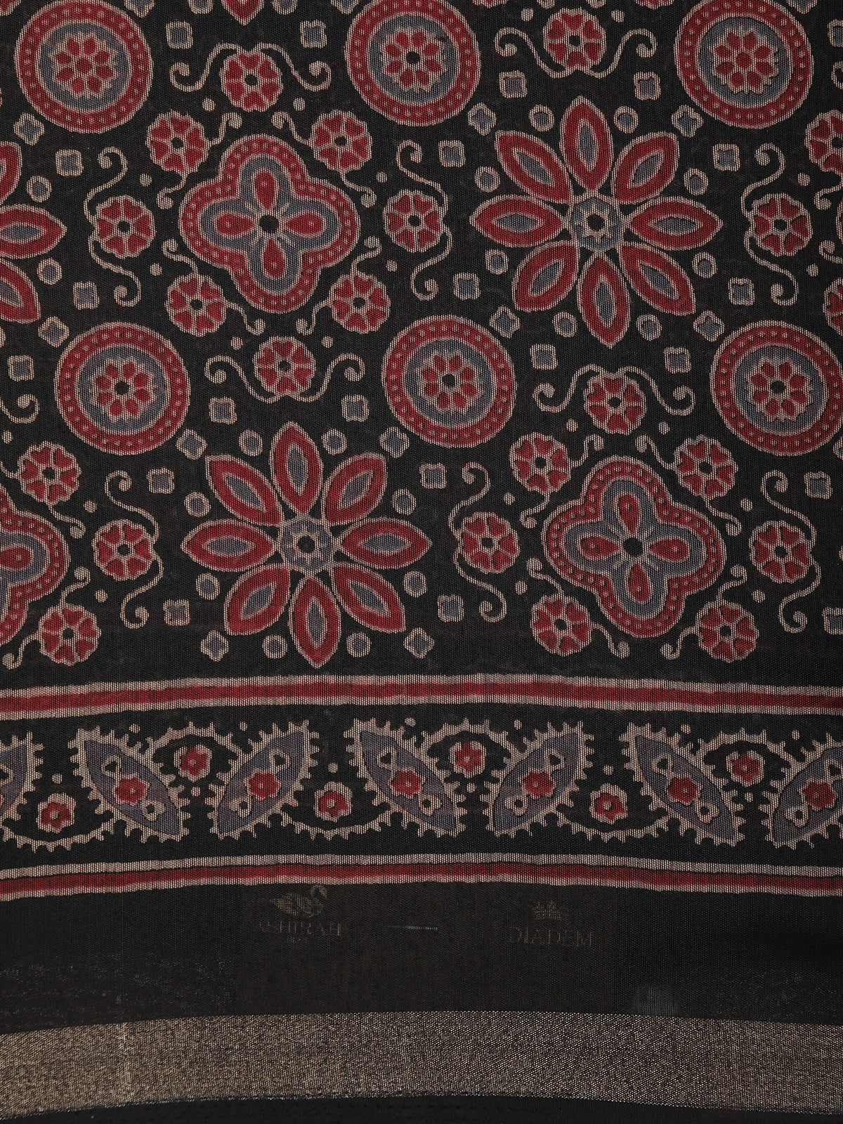 This elegant mixed silk cotton fancy saree showcases a timeless Kalamkari-inspired printed design that blends classic tradition with modern appeal. The deep black base is beautifully adorned with intricate floral and medallion motifs in rich red and muted grey tones, creating a striking contrast and refined ethnic look.