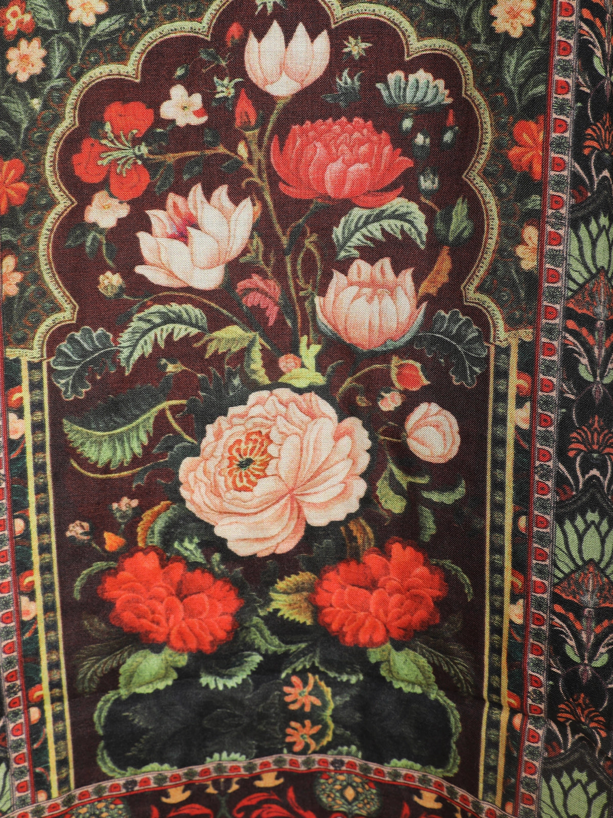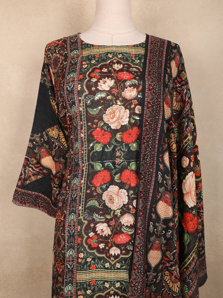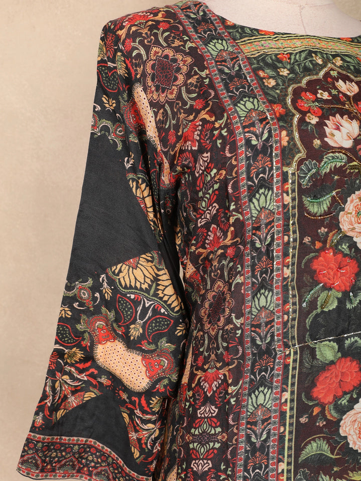 Indulge in the beauty of traditional artistry with this exquisite Black Kashmiri Floral Printed Crepe Straight Cut Salwar Suit. Inspired by the intricate patterns of Kashmiri craftsmanship, the suit features vibrant floral motifs in tones of red, green, and beige that stand out against the rich black backdrop. The detailed border prints on the neckline, sleeves, and hemline add a touch of regal elegance, making it a timeless festive staple.