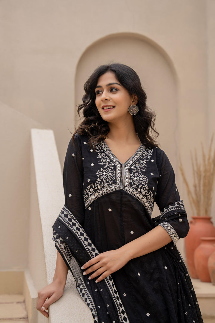Embrace timeless elegance with this beautifully crafted black kurti set, designed to make every moment special. The kurti features exquisite white thread embroidery and delicate mirror work on the neckline, adding a touch of shimmer and sophistication to the classic black base. Subtle buttas are placed across the fabric, enhancing its graceful appeal.