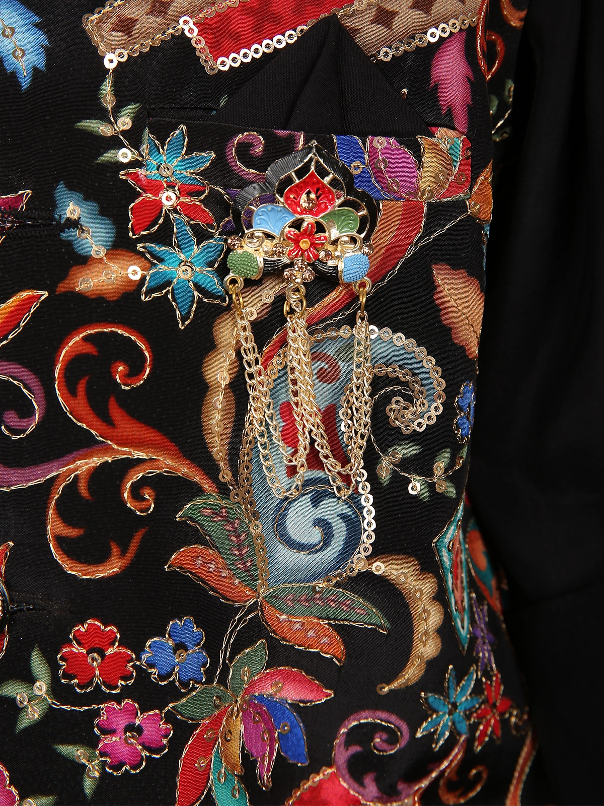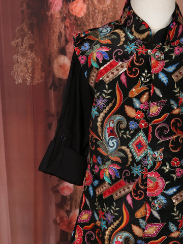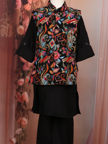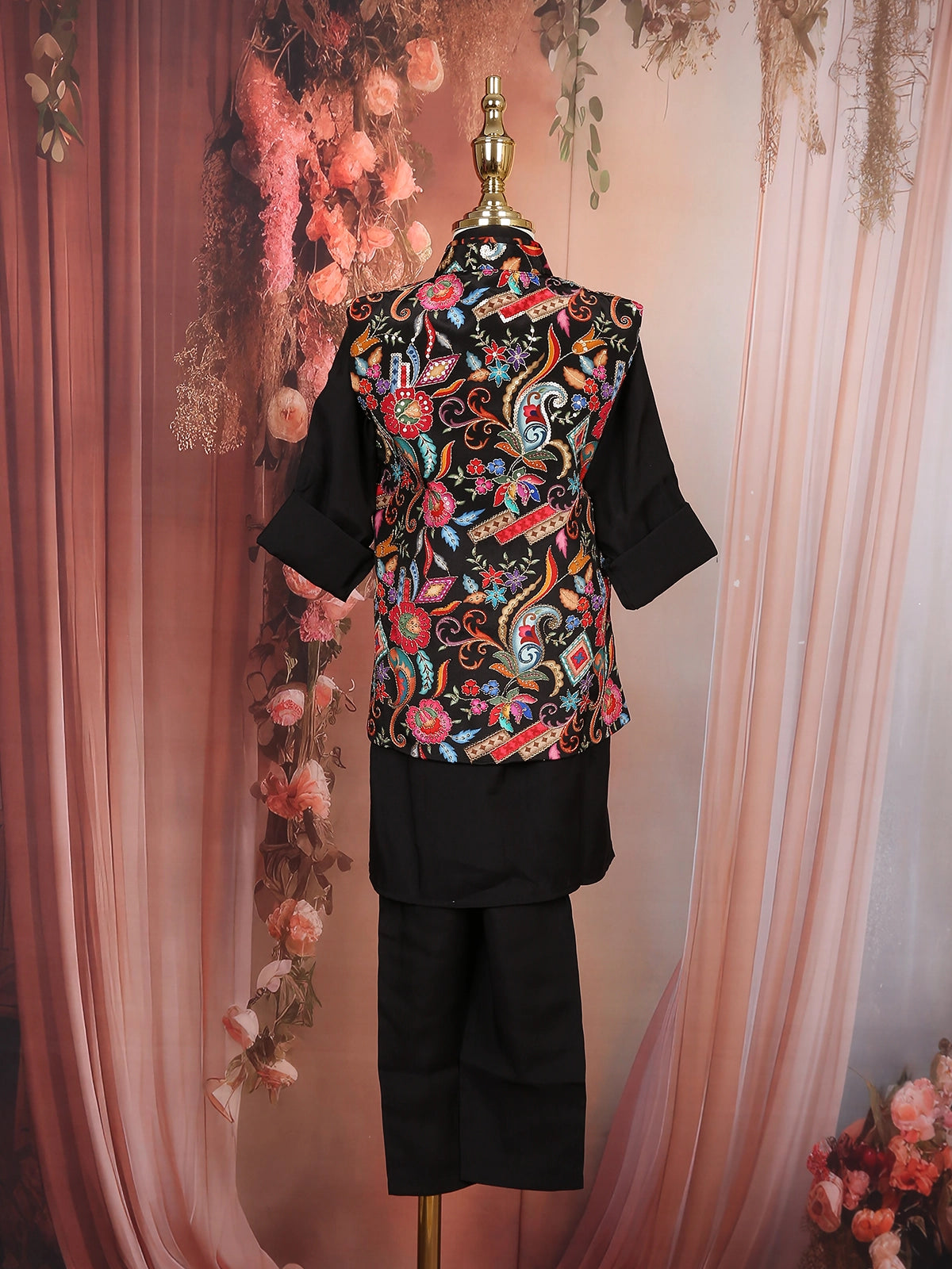 Black Multicolor Floral Embroidered Jacket Silk Kurta Set for Boys