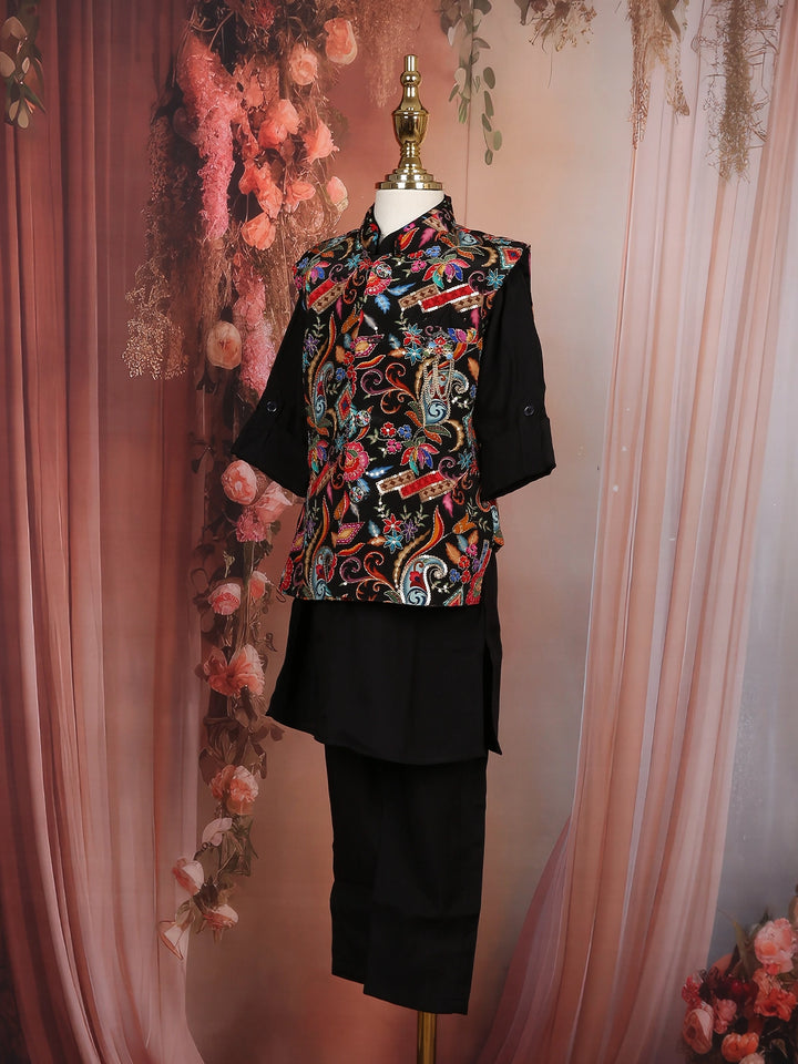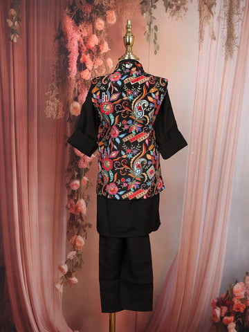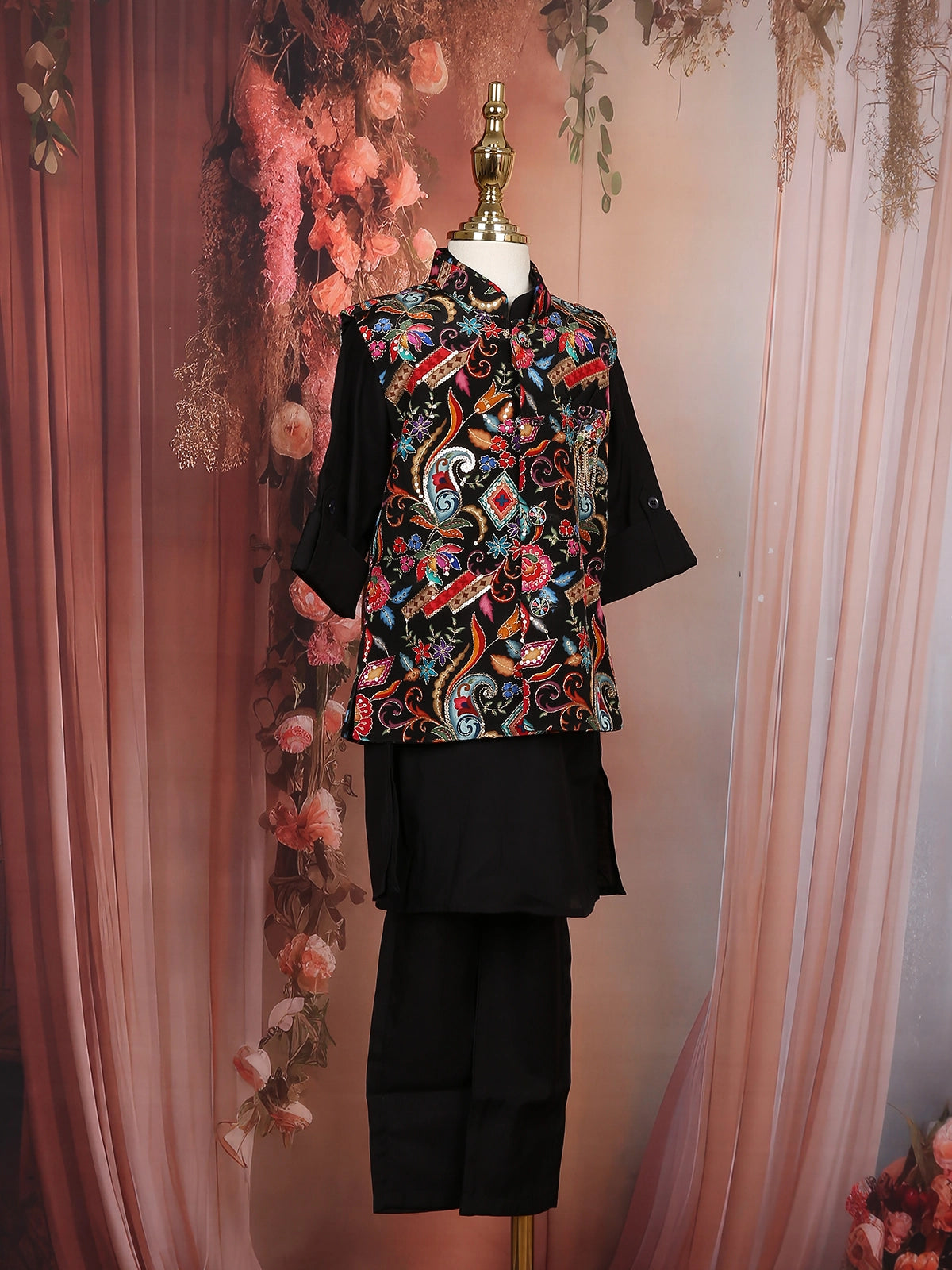 Dress your little trendsetter in this eye-catching Black Multicolor Embroidered Jacket Kurta Set that blends boldness with tradition. The sleek black kurta and pants provide a modern and sharp foundation, while the vibrantly embroidered jacket takes center stage with its rich floral and abstract motifs. Sparkling sequin accents add a festive glow, making the outfit perfect for celebrations.