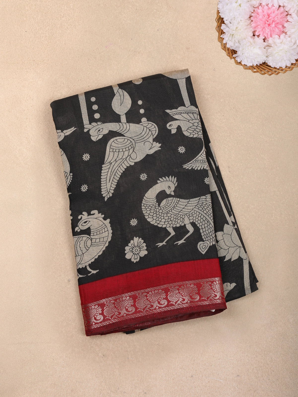 Graceful and elegant, this Black Chanderi Cotton Saree brings together traditional artistry and everyday comfort. The saree features intricate peacock and floral printed motifs across the body, giving it a heritage-inspired look that is timeless and refined. The lightweight Chanderi cotton fabric drapes beautifully, making it easy to carry through the day while maintaining a sophisticated silhouette.