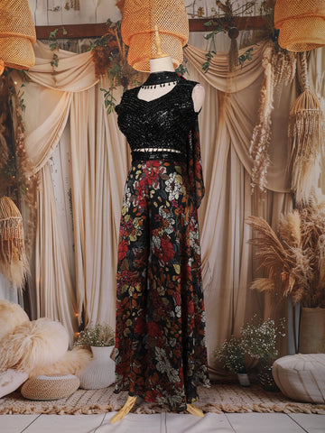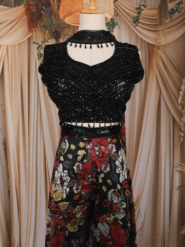 Radiate festive glamour with this Black Sequin Embroidered Crepe Palazzo Suit, a perfect combination of sophistication and sparkle. The outfit features a sleeveless round-neck top beautifully embellished with shimmering sequin embroidery, adding a luxurious sheen and festive appeal.