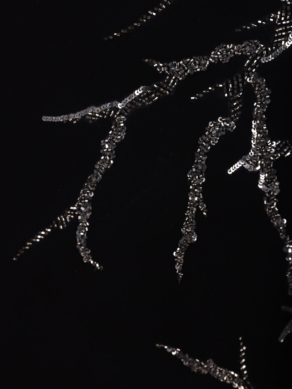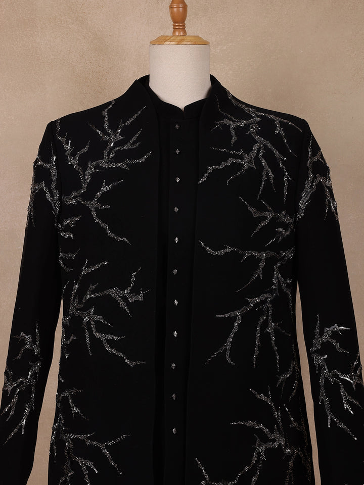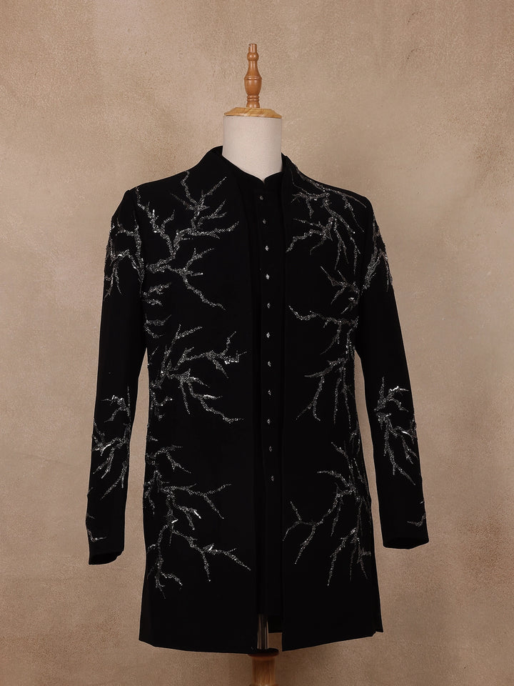 The sherwani is accentuated with silver sequin embroidery arranged in an intricate, abstract branch-inspired pattern across the front, sleeves, and shoulders—creating a dynamic play of shimmer against the deep black base. The mandarin collar and sleek concealed placket lend a contemporary edge, while matching buttons add to its regal charm.