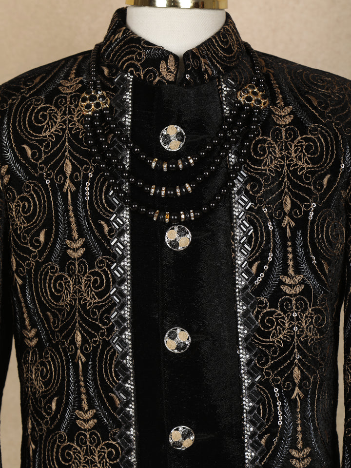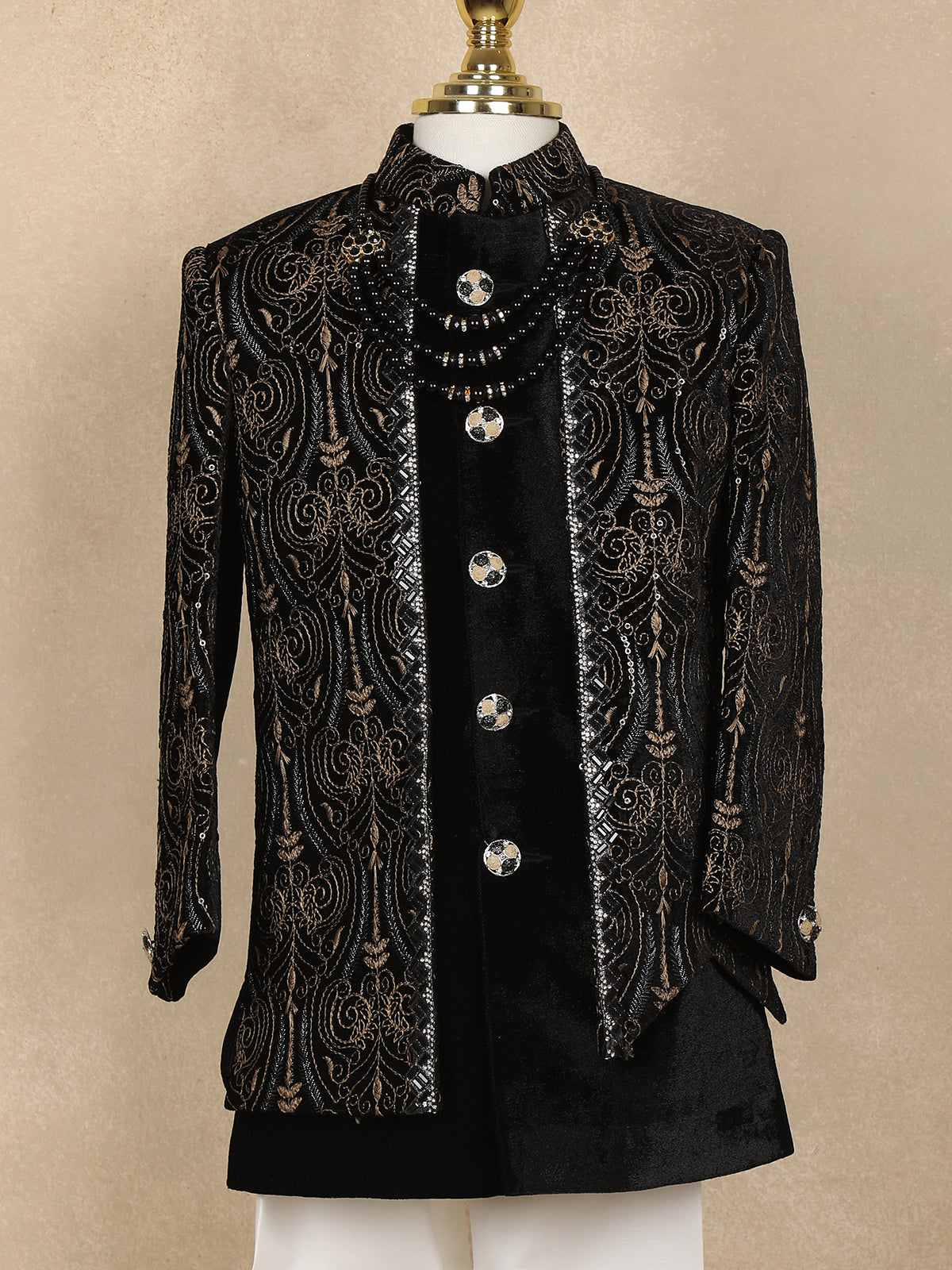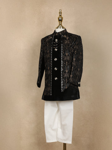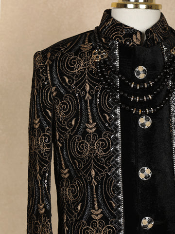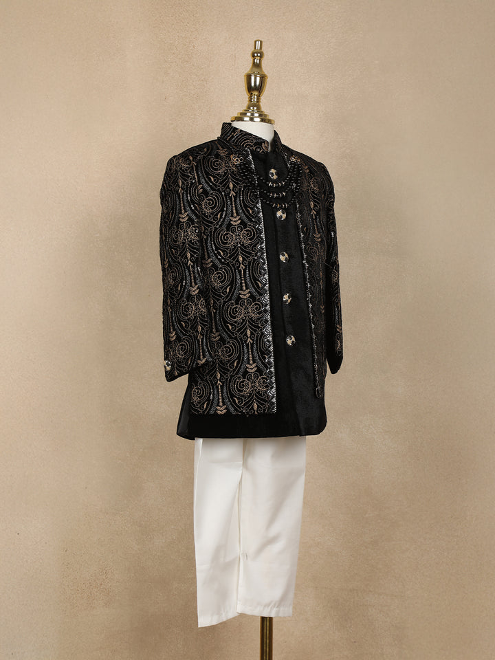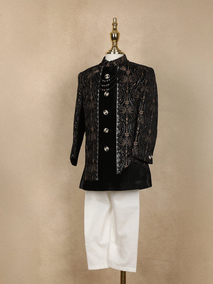 Black Sequins Embroidered Kids Velvet Sherwani Set with White Pants