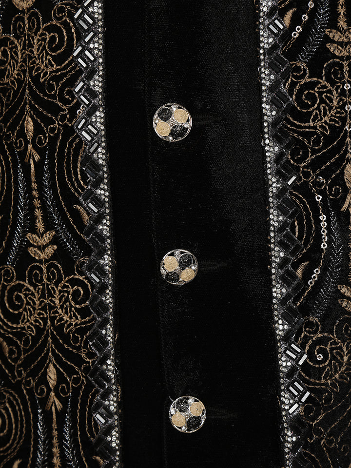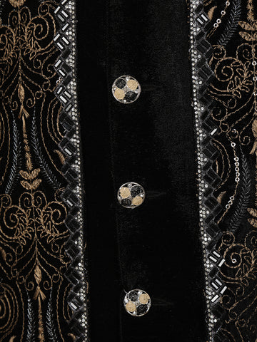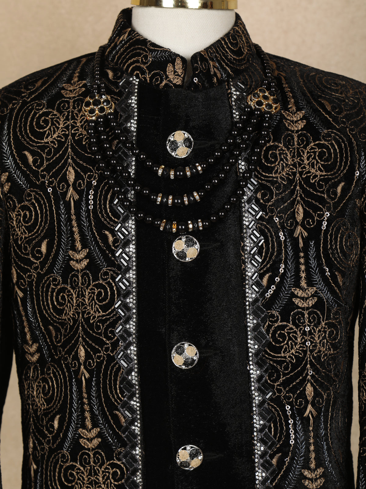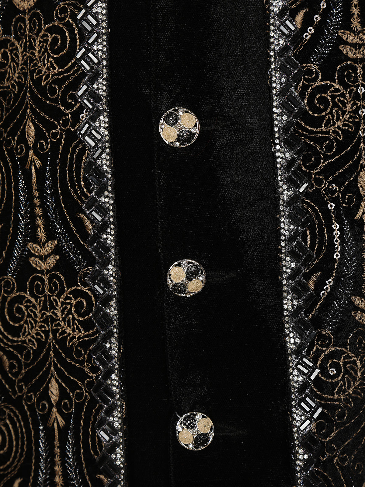 Black Sequins Embroidered Kids Velvet Sherwani Set with White Pants