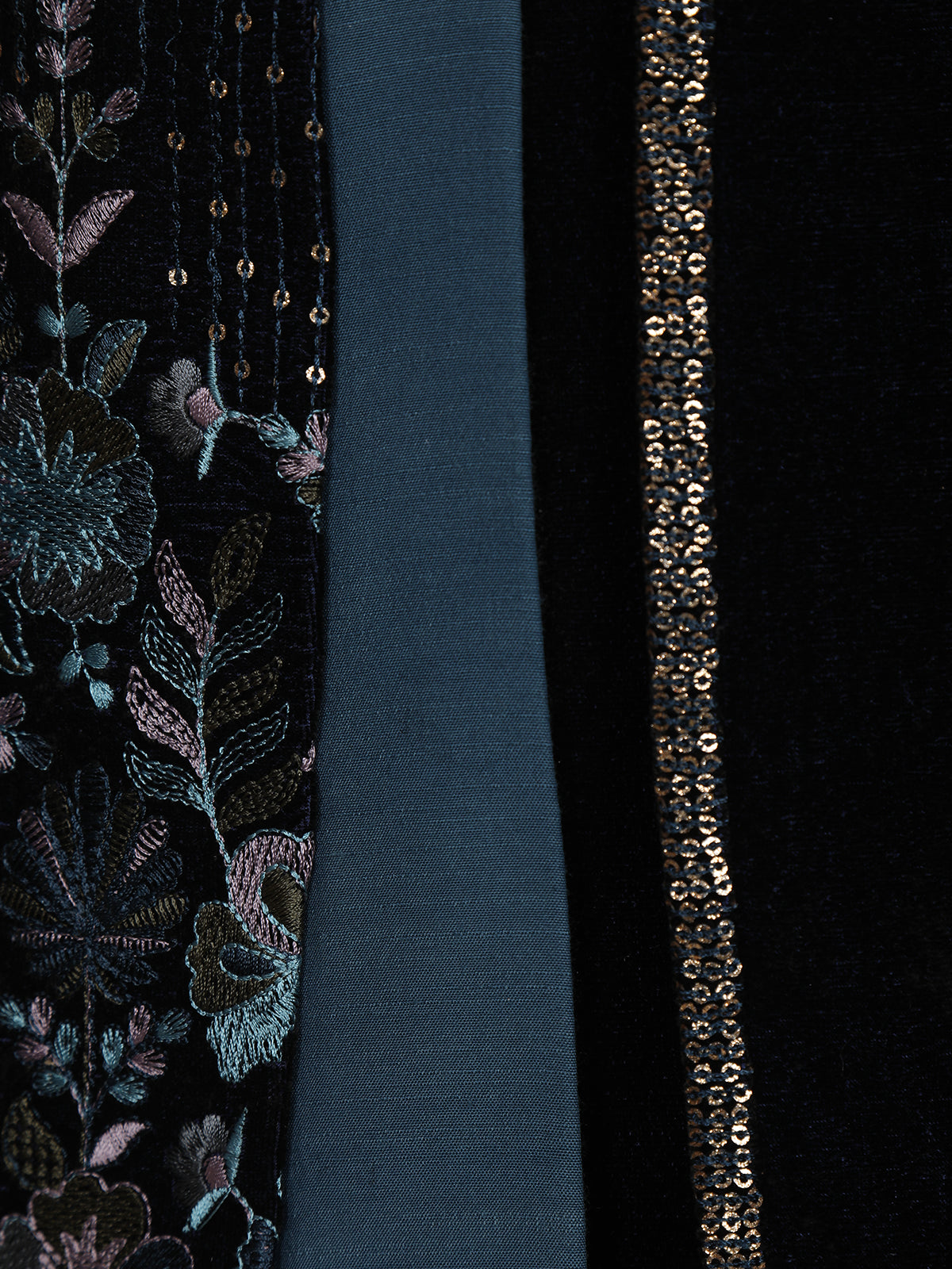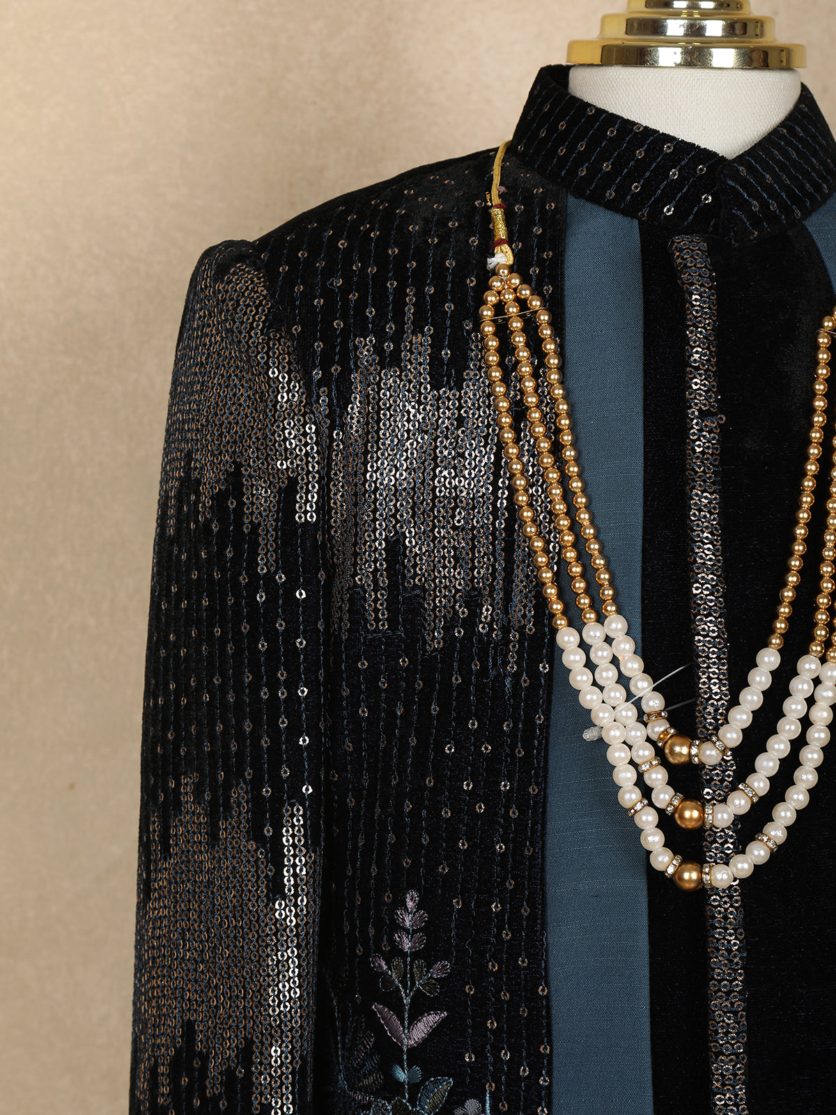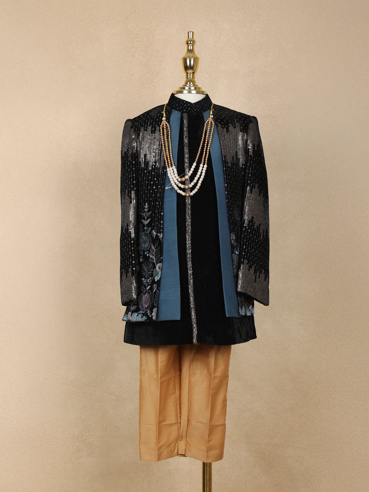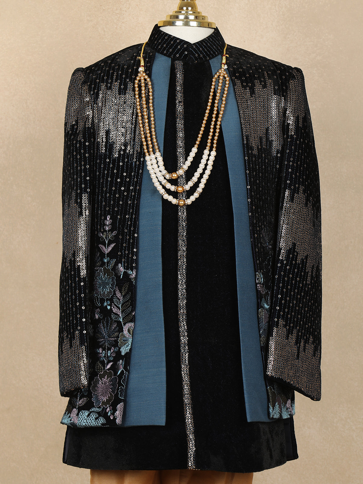 Give your little prince a royal makeover with this luxurious black velvet sherwani set. Designed with shimmering sequins on the sleeves and elegant floral embroidery panels, this ensemble brings together tradition and modern glamour. The mandarin collar and sleek front detailing add to the sophisticated appeal, while the beige pants create a perfect contrast for festive elegance. Paired with a charming multi-layered pearl mala, this outfit is an ideal choice for weddings, receptions, and grand celebrations.