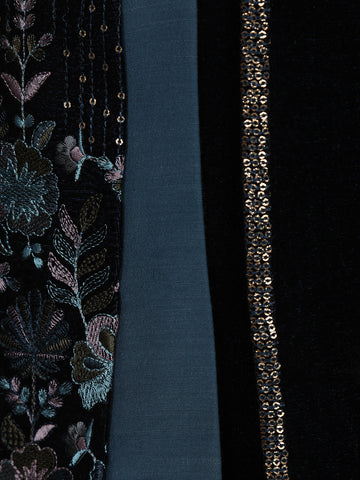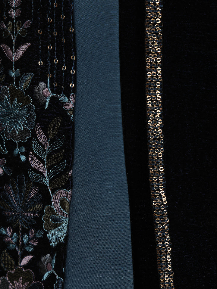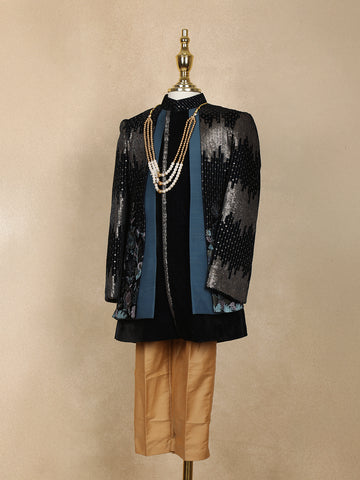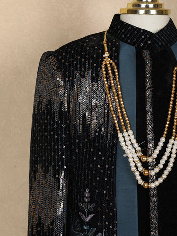 Black Sequins Embroidered Velvet Kids Sherwani Set