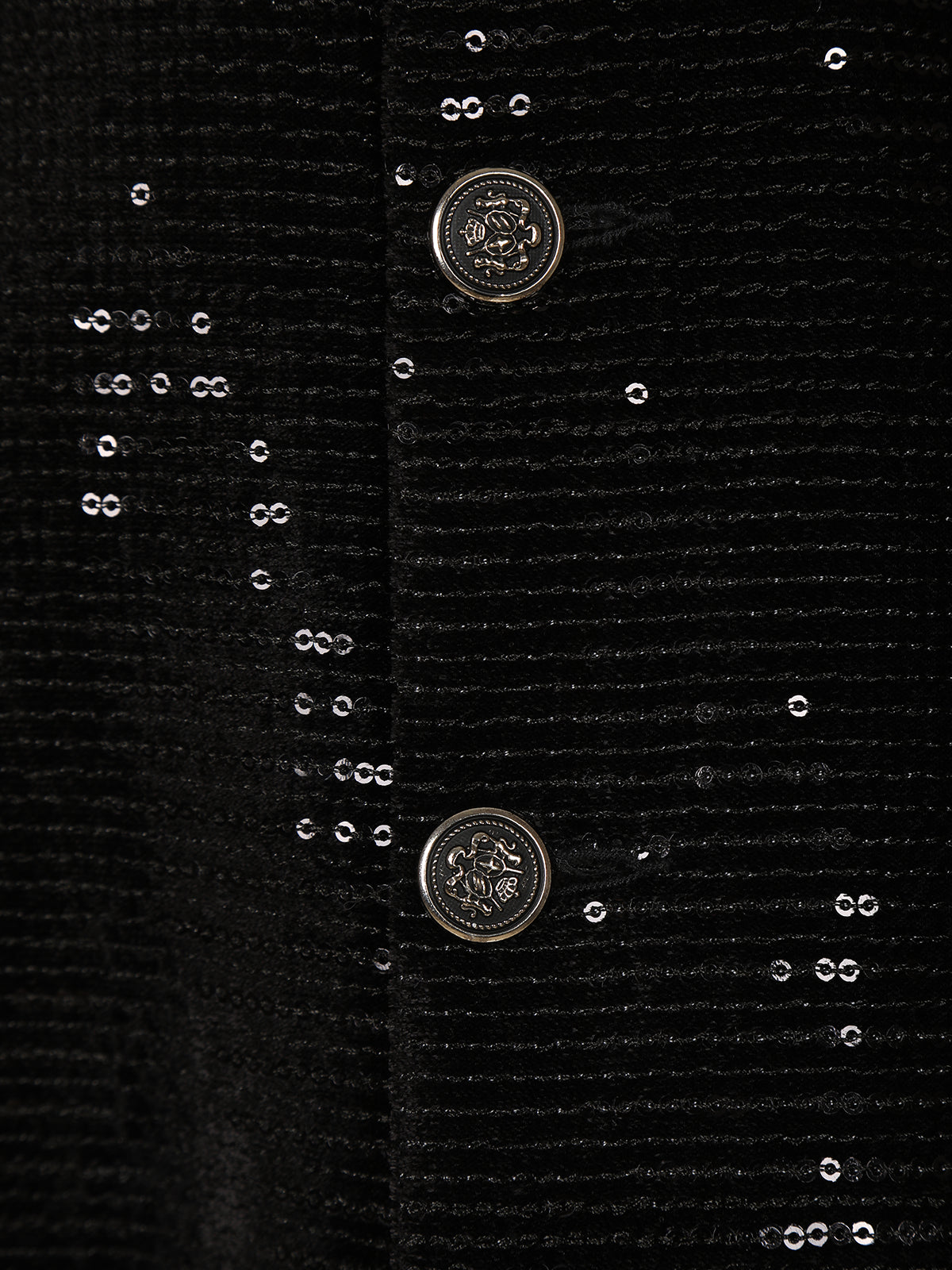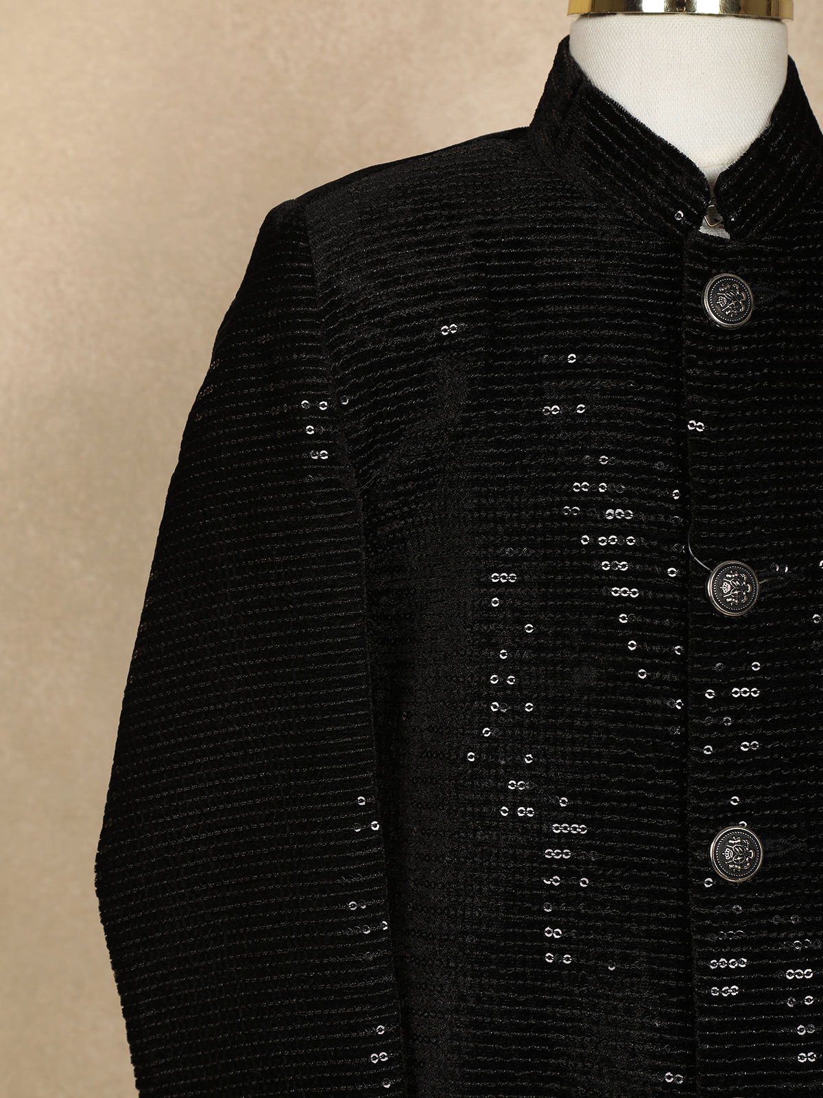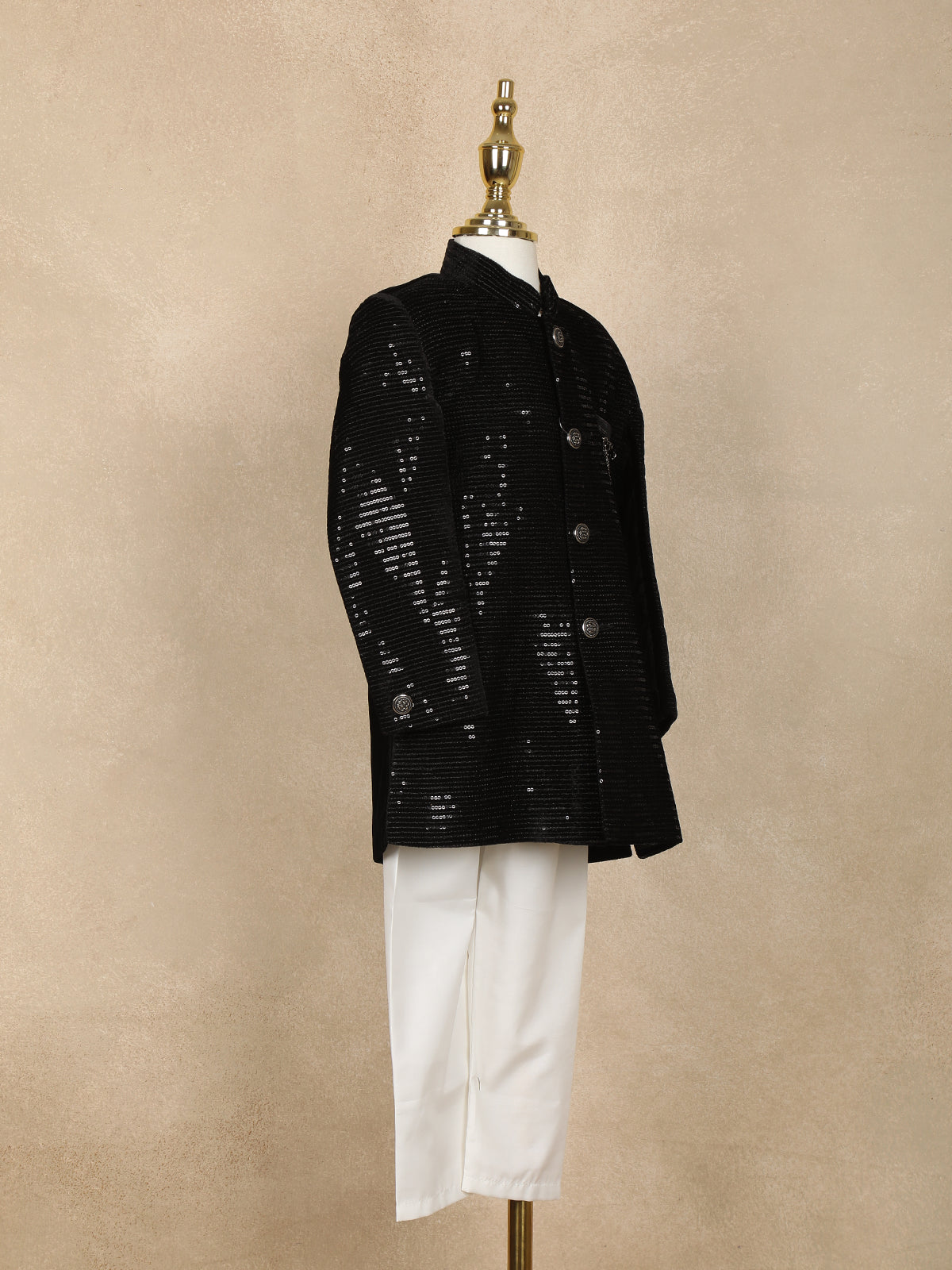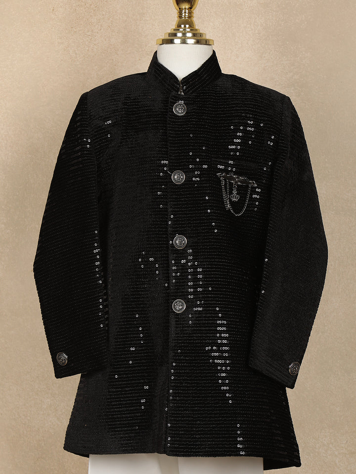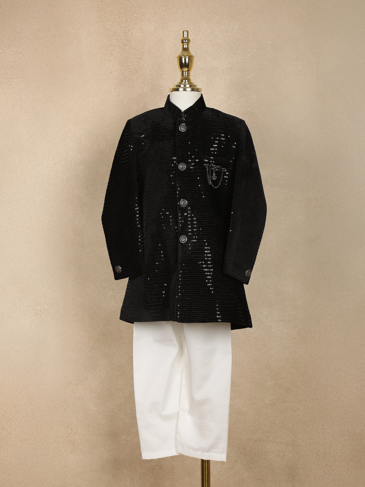 Black Sequins Embroidered Velvet Kids Sherwani Set with White Pants