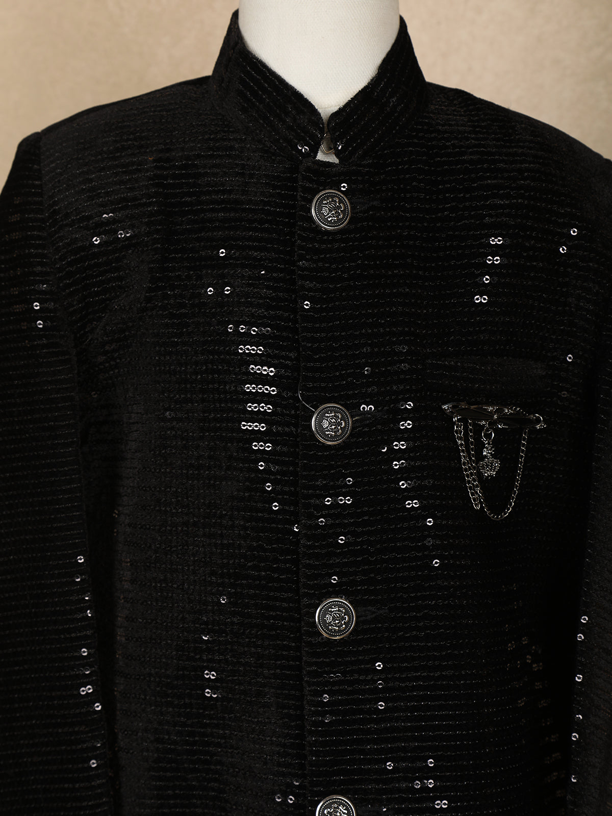 Dress your little one in elegant charm with this premium black velvet sherwani set. Designed with all-over sequin embellishments that subtly shimmer with every move, this outfit brings a festive yet classy appeal to any special occasion. The mandarin collar and metal button detailing add a regal finish, while the detachable brooch chain enhances the royal look. Paired with crisp white trousers for a sophisticated contrast, this sherwani ensures comfort along with standout style — perfect for weddings, receptions, festive gatherings, and family celebrations.