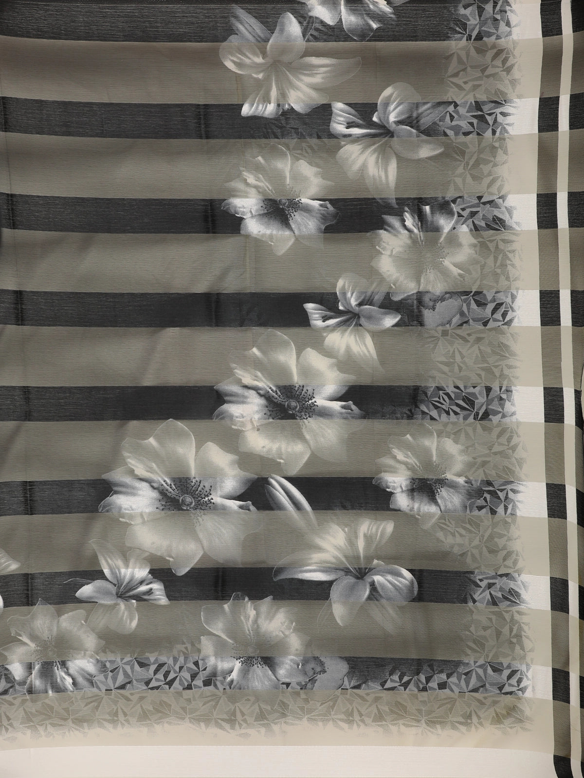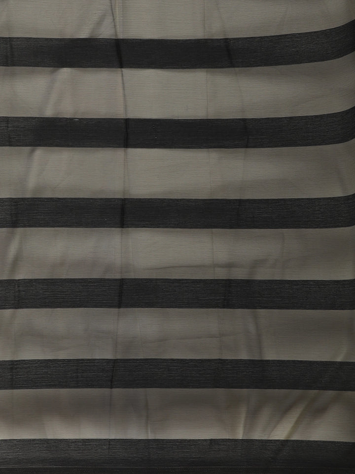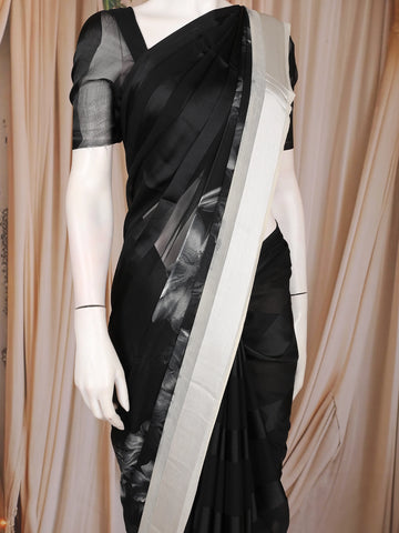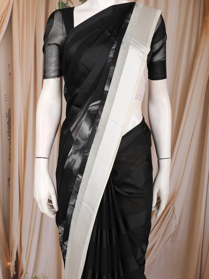 A striking contrast white border adds a clean, modern highlight to the saree, giving it definition and enhancing the overall sophistication. The lower part of the saree features a subtle shaded effect, adding depth and a touch of artistic flair without overwhelming the minimal look. Paired with a matching black blouse featuring sheer short sleeves, the ensemble feels both polished and contemporary.