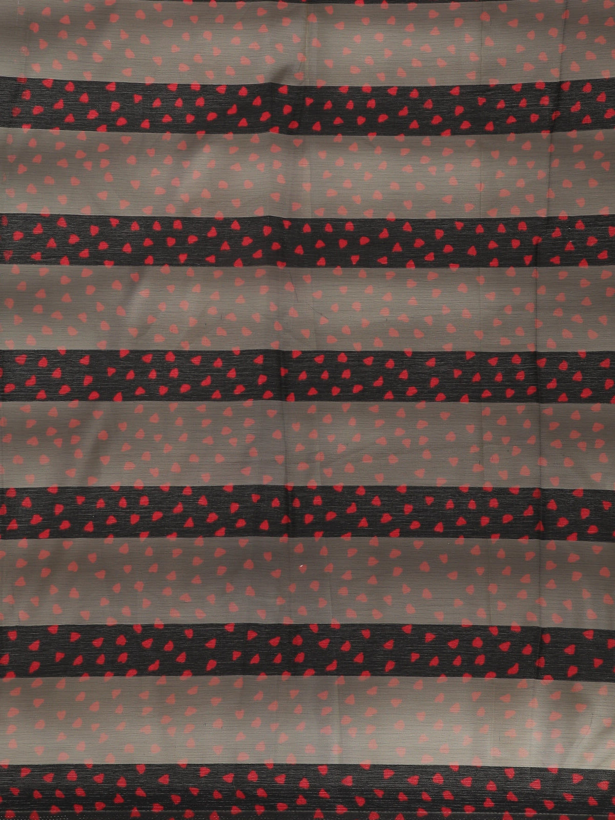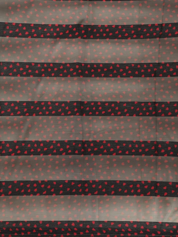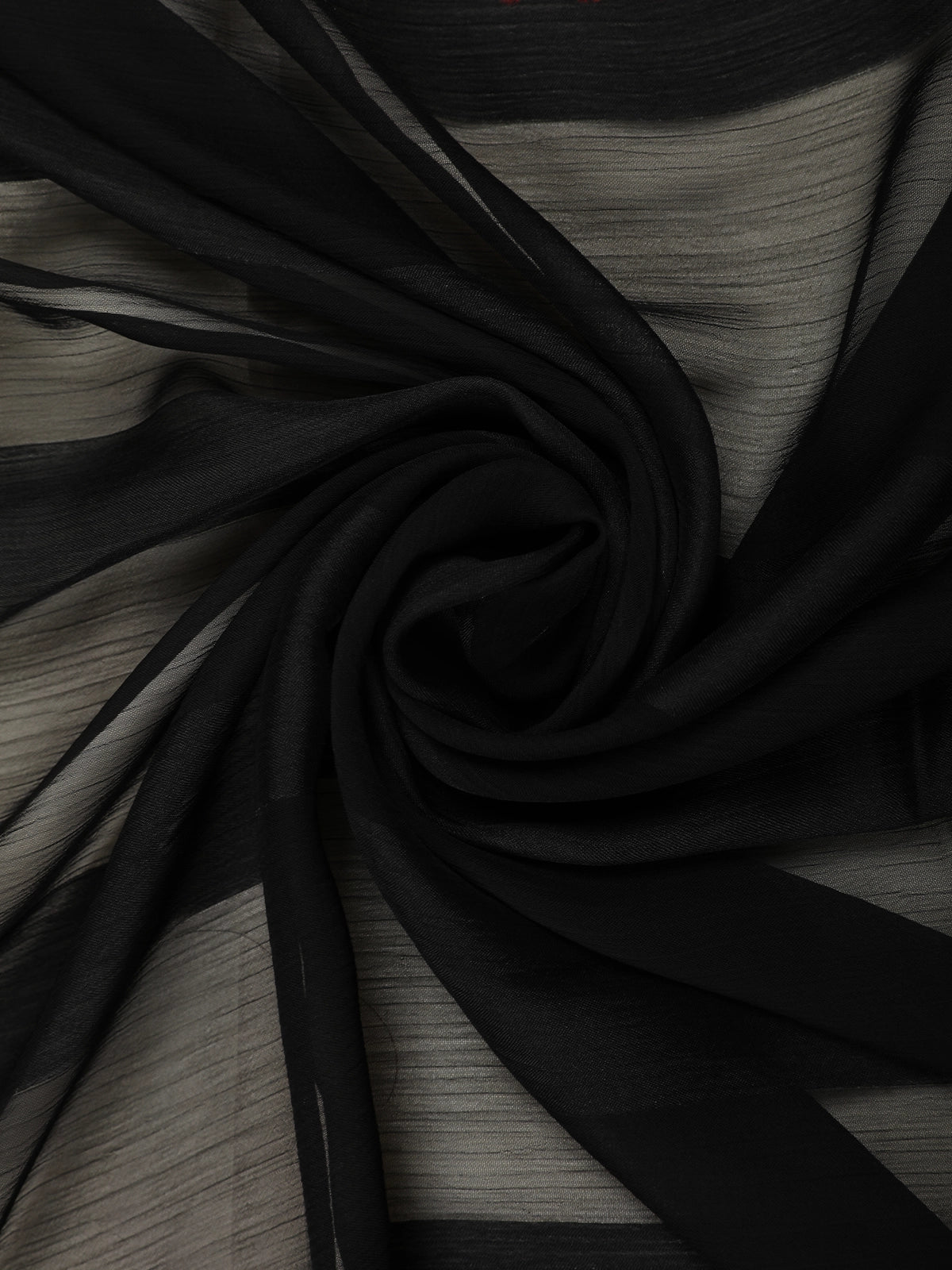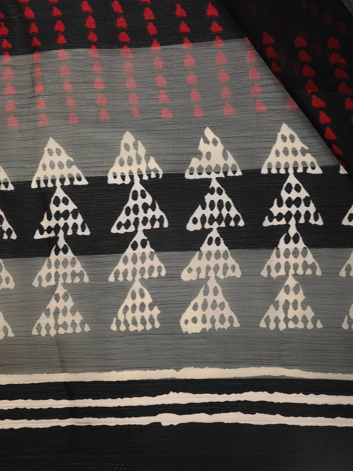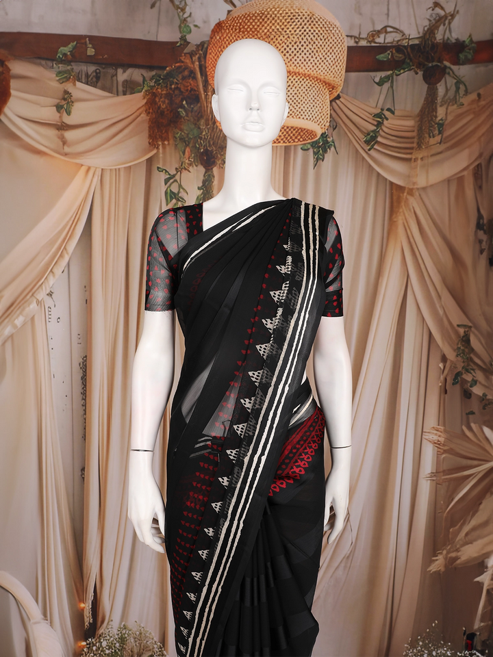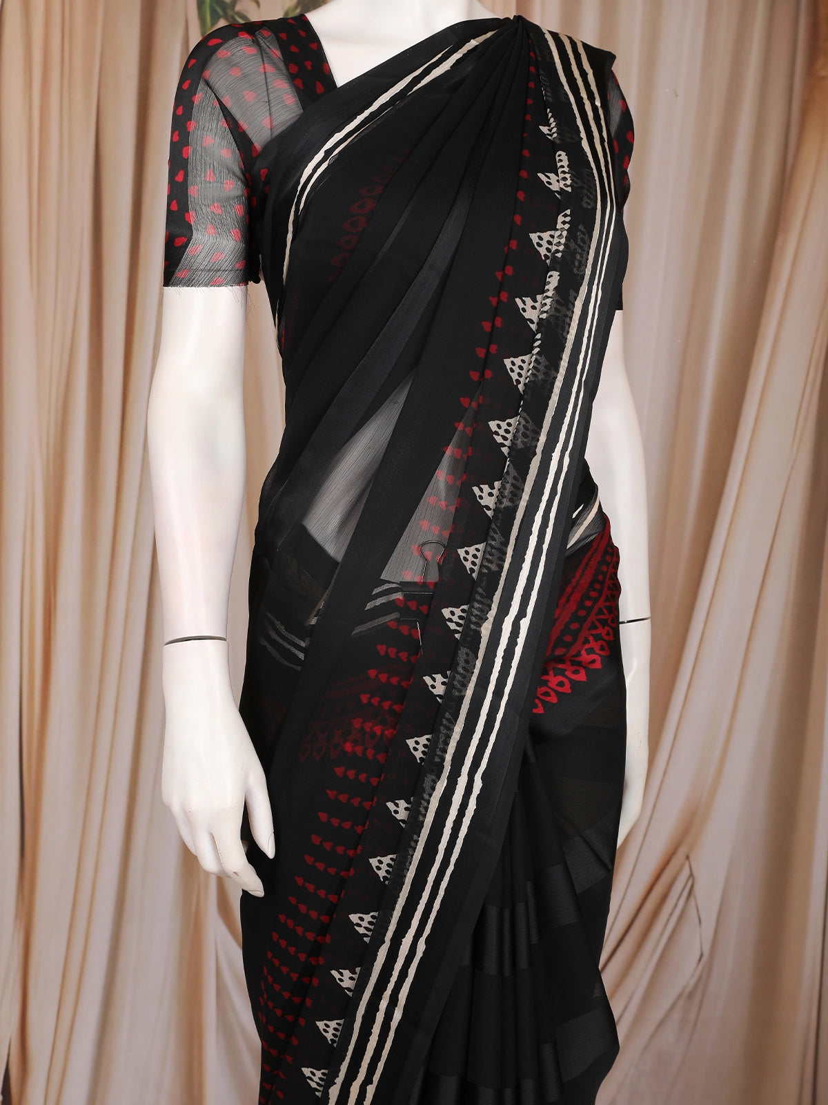 This black chiffon saree brings together simplicity and elegance in the most graceful way. The soft and lightweight chiffon fabric drapes beautifully over the body, giving a smooth and refined silhouette. The saree is designed with subtle printed accents and a contrast white patterned border that adds definition and sophistication without overpowering the look. The touch of maroon detailing near the pleats adds a hint of depth and character, enhancing the saree's contemporary appeal.
