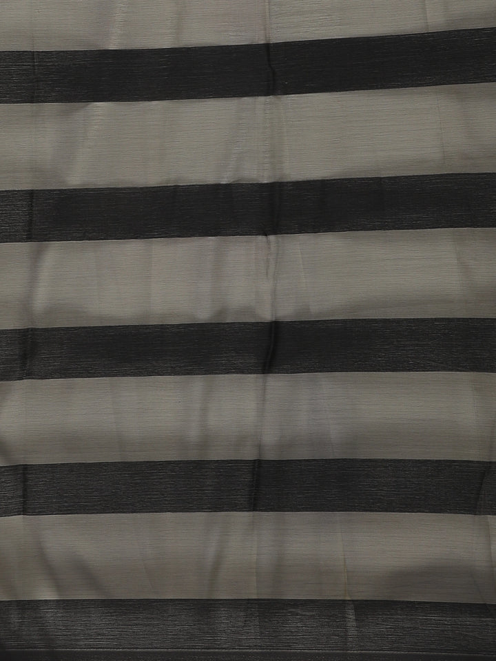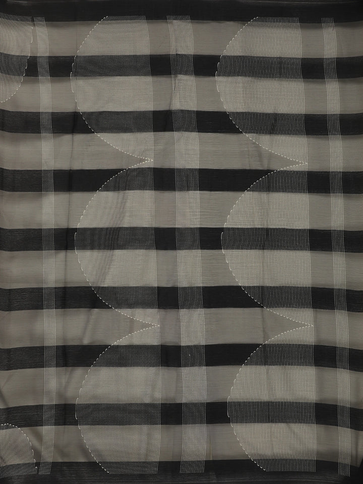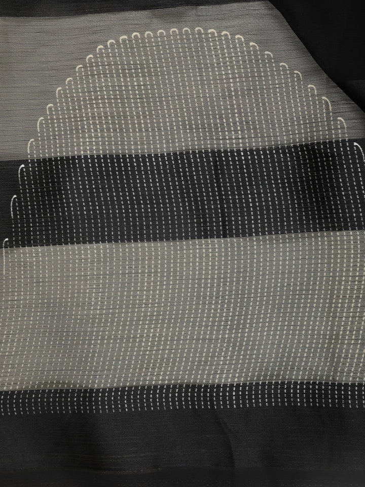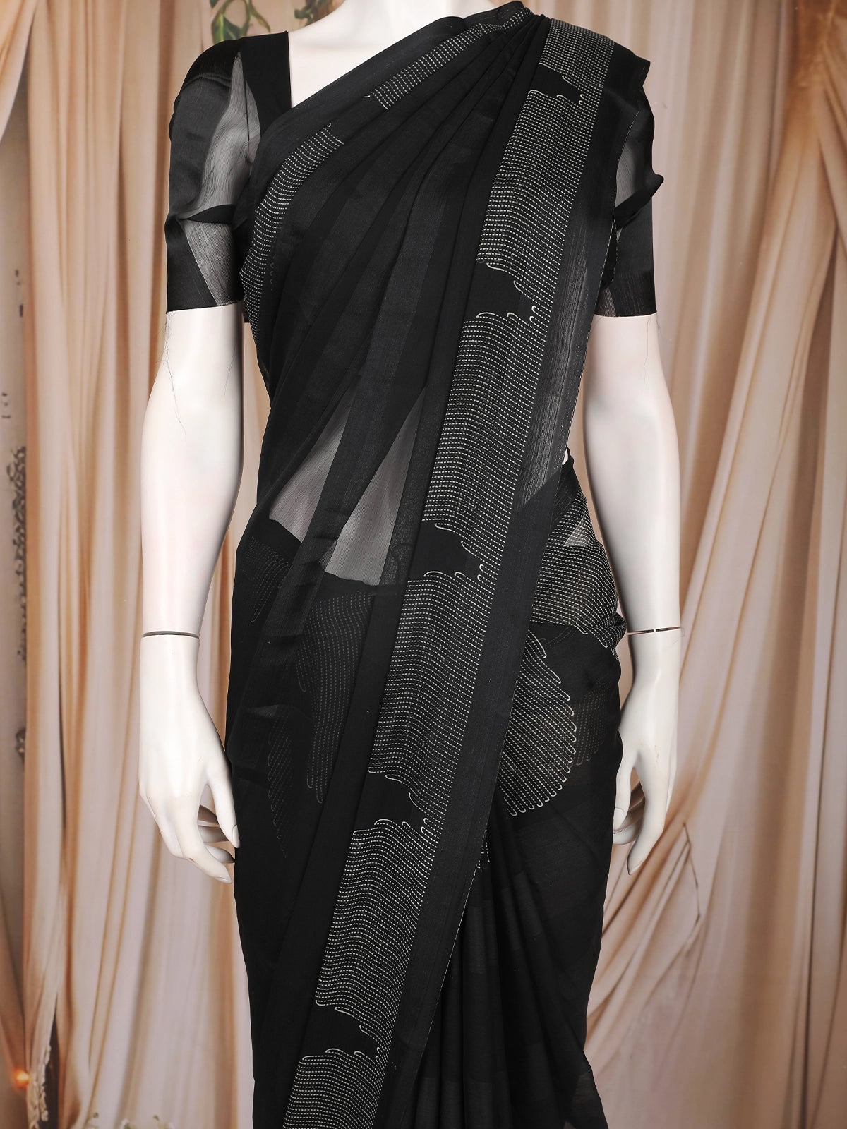 A subtle yet striking contrast white patterned border adds definition to the saree, enhancing its overall look while maintaining a sophisticated balance. The border detail lends a touch of finesse without overpowering the saree’s minimalist elegance. Paired with a matching black blouse featuring sheer short sleeves, the ensemble maintains a polished and contemporary look.