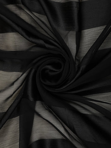 This black chiffon saree showcases a blend of simplicity and refined elegance. The saree features a solid black base that gives it a timeless, graceful appeal, making it a versatile choice for multiple occasions. The lightweight chiffon fabric drapes beautifully, offering a soft and fluid fall that flatters every silhouette with effortless charm.