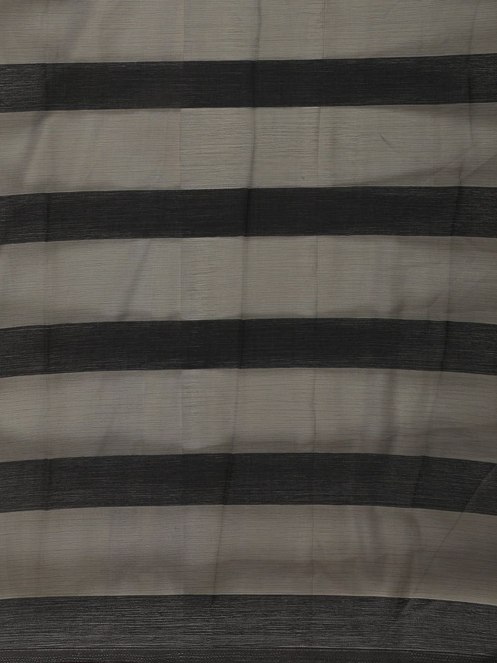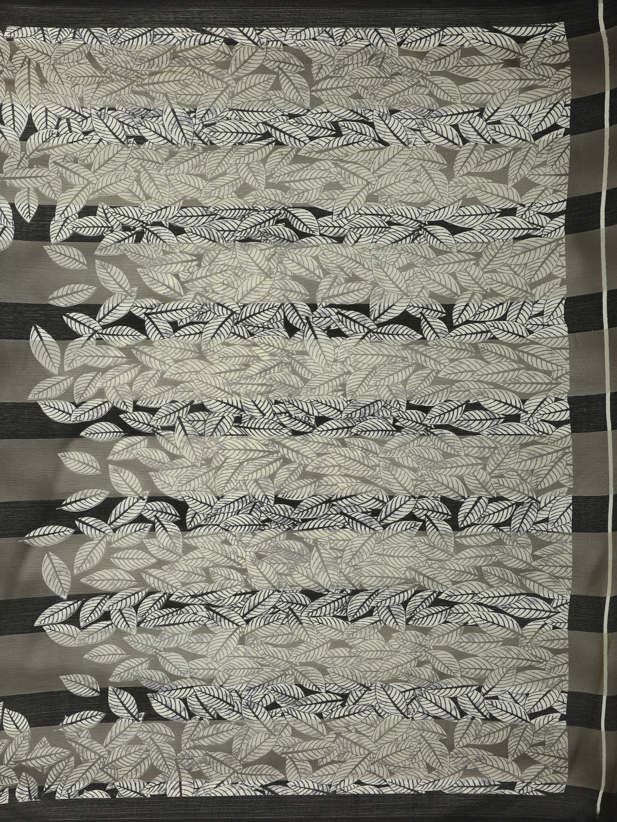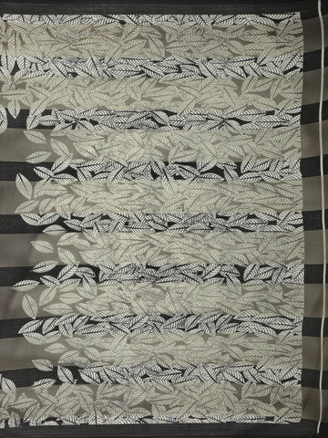 The pallu carries a dense leafy spread, adding a soft artistic movement to the saree, while the body remains subtly striped with semi-sheer detailing for a chic, modern finish. Paired with a matching printed blouse, it offers a sophisticated and contemporary appeal.