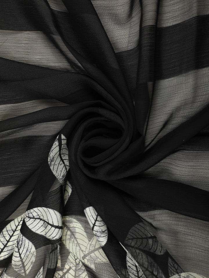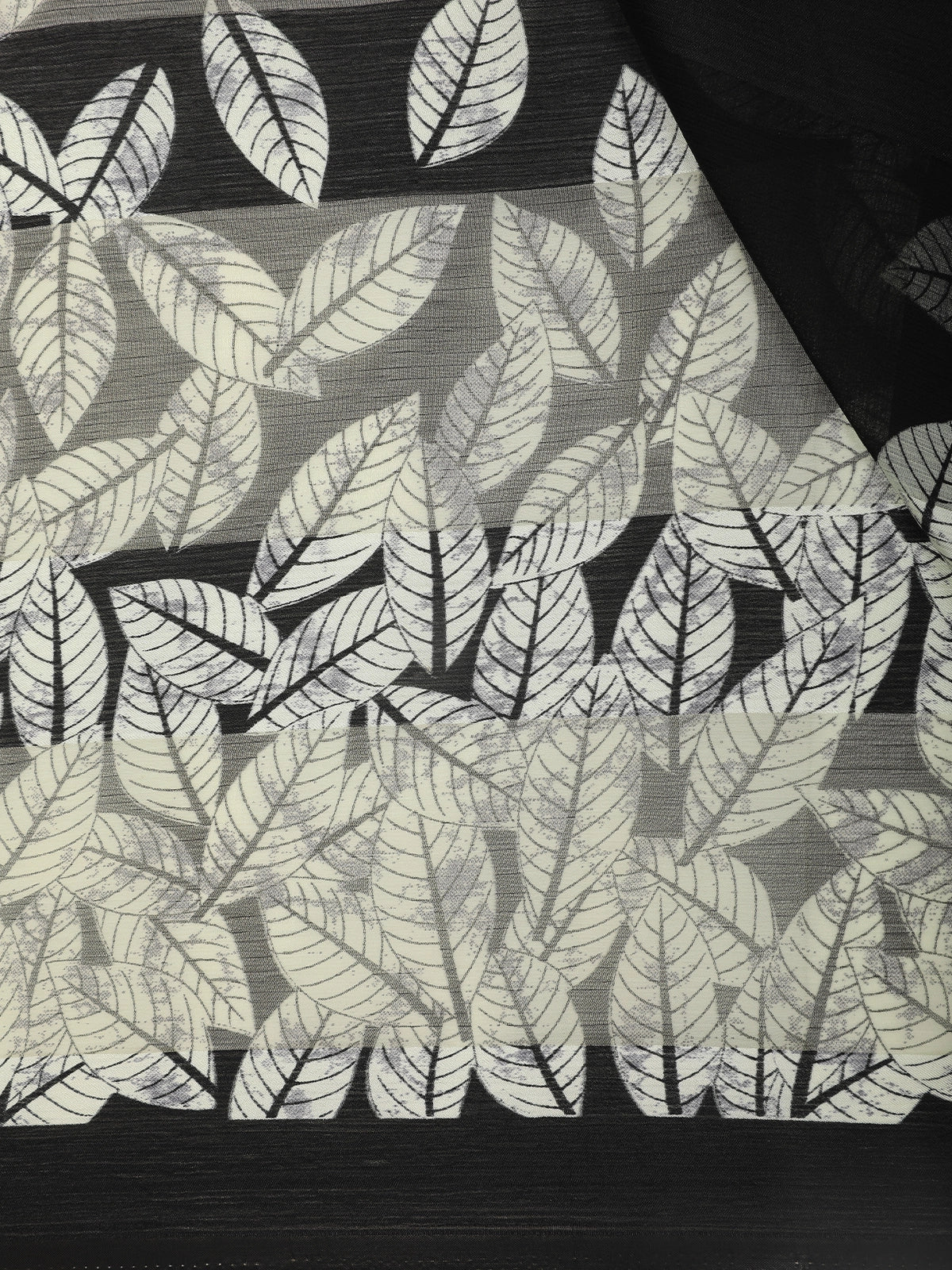 Give your wardrobe a touch of graceful elegance with this Black Leaf Printed Chiffon Saree. The saree features a delicate leaf motif print gracefully flowing along the border, creating a refined contrast that enhances its overall charm. Made from lightweight chiffon, it drapes beautifully and offers effortless comfort, making it perfect for long wear.